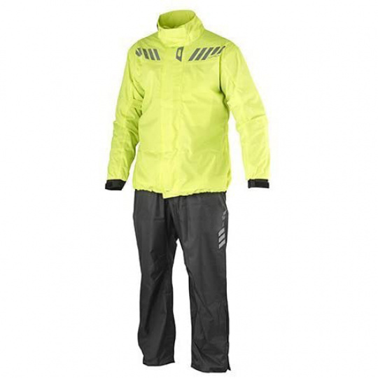 Nepromokavý dvoudílný oblek pro motorkáře. Fluo žlutá bunda s reflexními prvky pro dobrou viditelnost i za špatných klimatických podmínek. Praktické černé kalhoty - špína není tolik vidět.