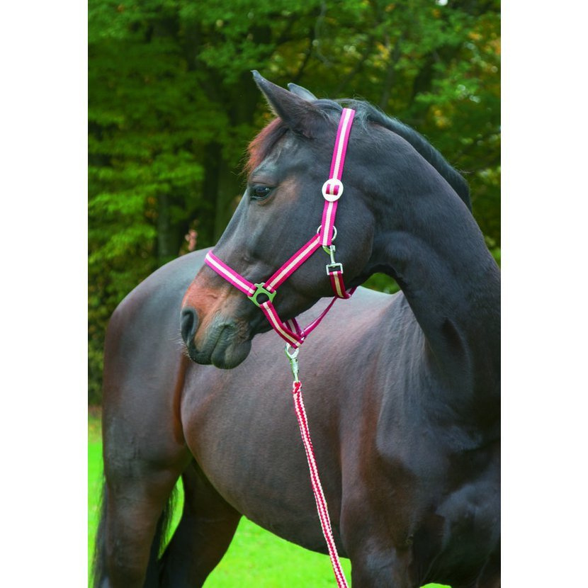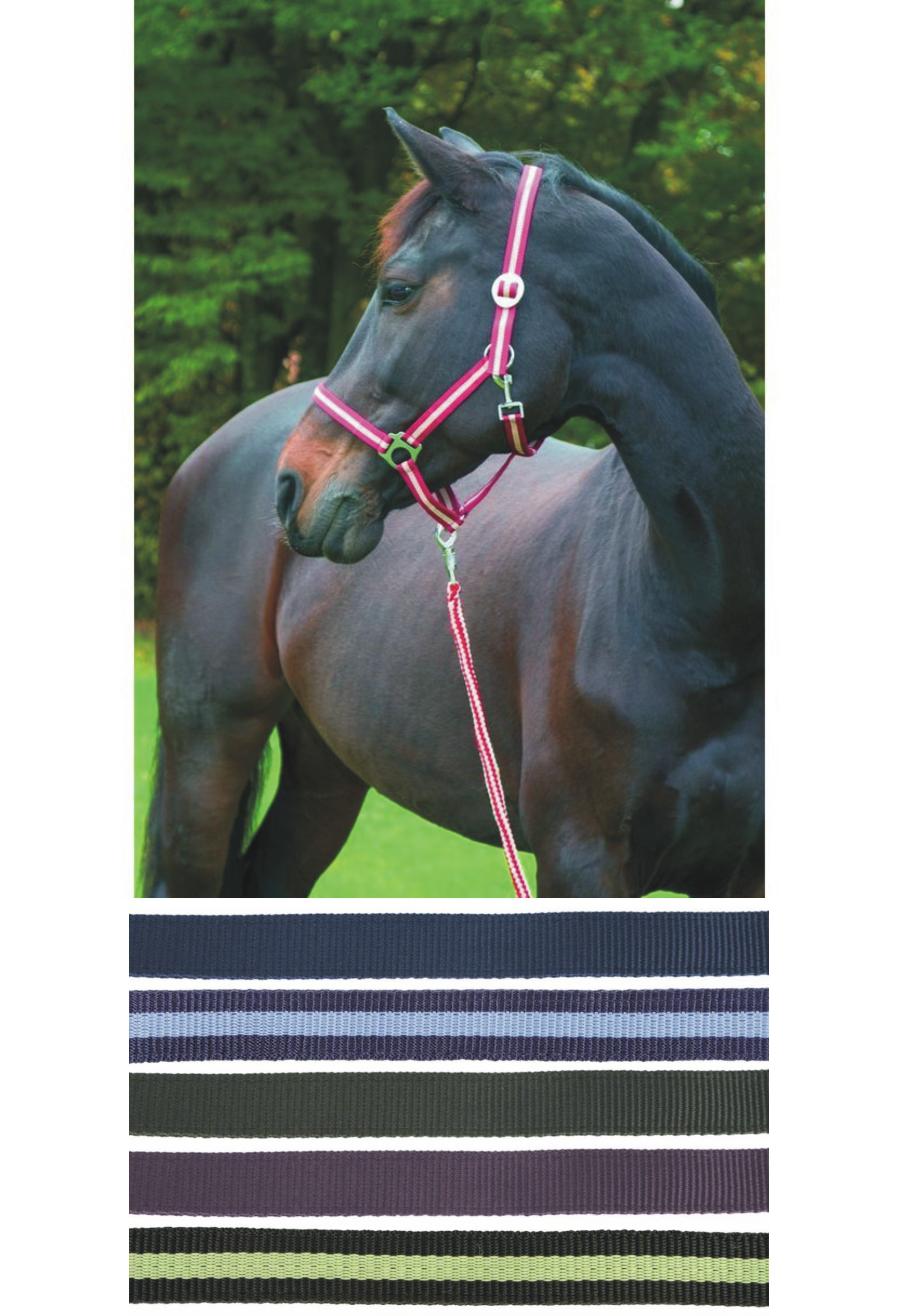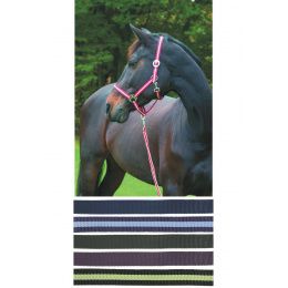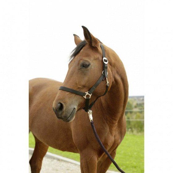 Cenově výhodná nylonová ohlávka Hippo s plynule nastavitelným nátylníkem, snadné odepínání podhrdelníku pomocí karabiny, nerezové kování.