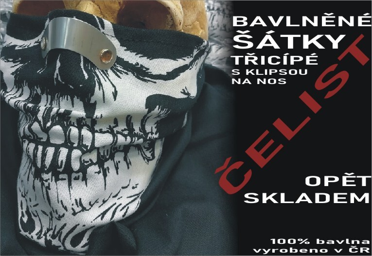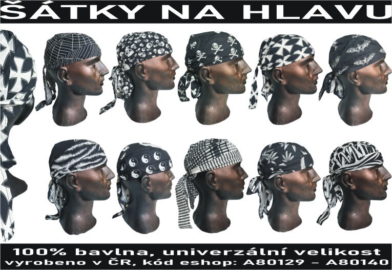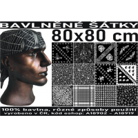 Velké balněné šátky čtyřcípé o velikosti 80x80 cm s oblíbenými motivy opět skladem. K nim přibyly i šátky na hlavu - čepičky a postupně doplňujeme i třicípé šátky s klipsnou na nos. Tyto šátky opět vyrábíme v naší dílně z materiálu vyrobeného a potištěného v České republice.