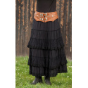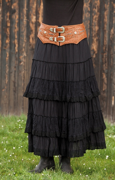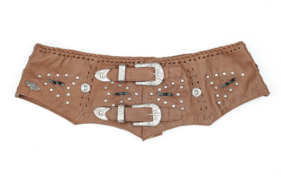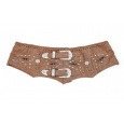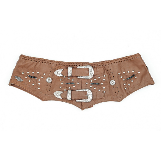 Kožený široký elegantní dámský opasek s dvěma přezkami, kovovým zdobením a třásněmi.