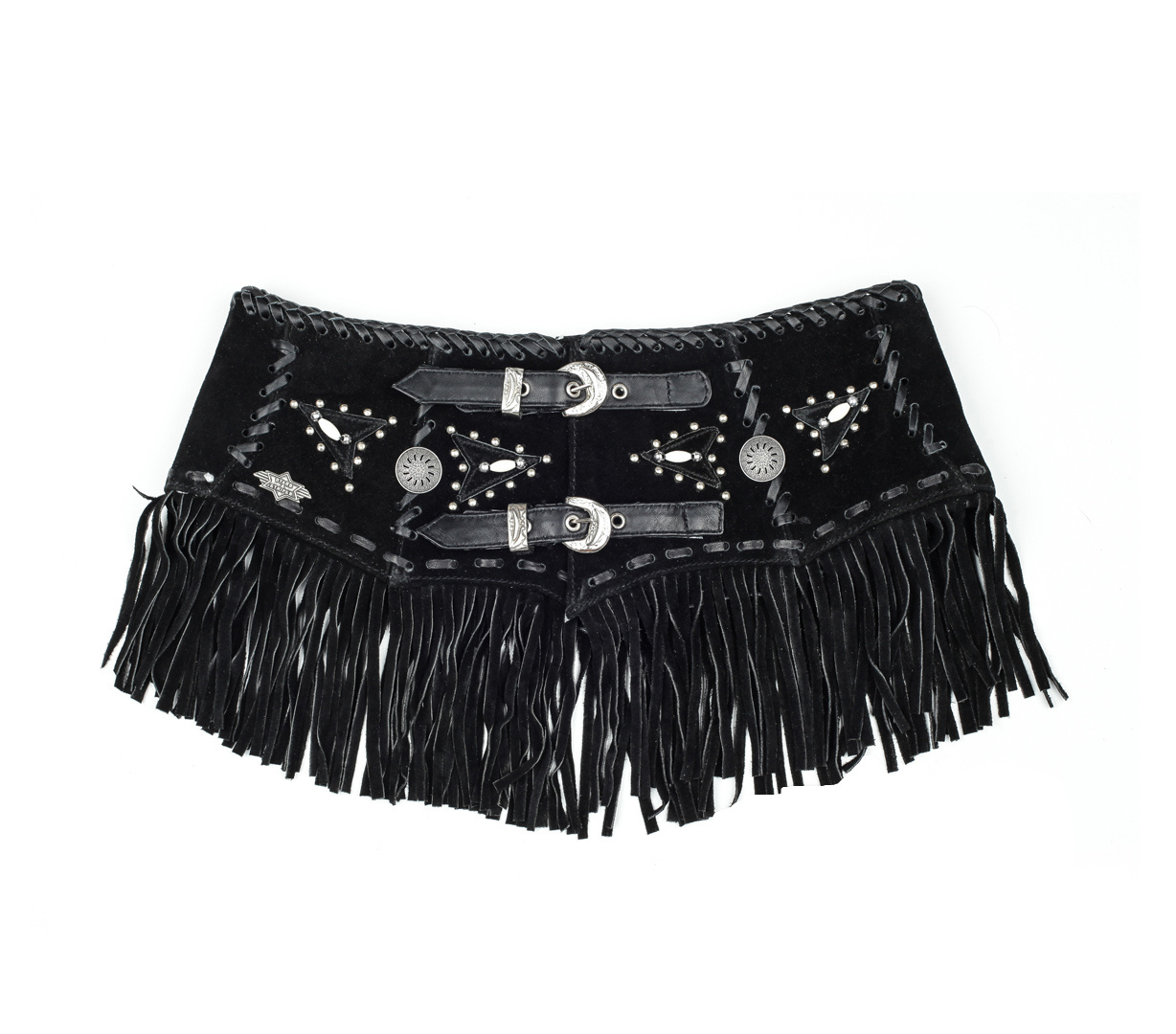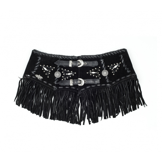 Kožený široký elegantní dámský opasek s dvěma přezkami, kovovým zdobením a třásněmi.