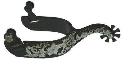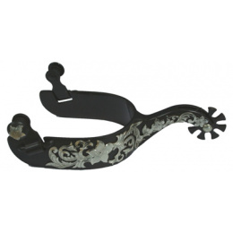 Hnědé ocelové show ostruhy s ručně rytým stříbrným zdobením. Kolečko s devíti paprsky.