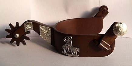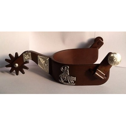 Hnědé ocelové ostruhy s ručně rytým stříbrným zdobením. Kolečko s desíti paprsky.