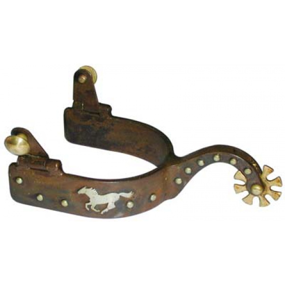 Hnědé rezavé ocelové show ostruhy s ručně rytým stříbrným zdobením, koněm a nýtky. Kolečko ve tvaru slunce s osmi paprsky.