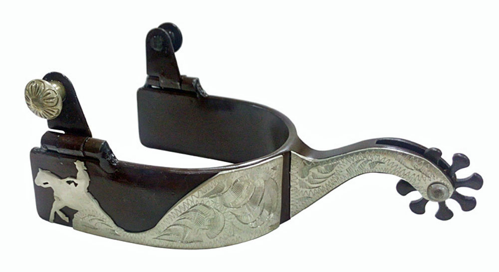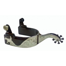 Hnědé ocelové show ostruhy s ručně rytým stříbrným zdobením. Kolečko ve tvaru slunce s devíti paprsky.