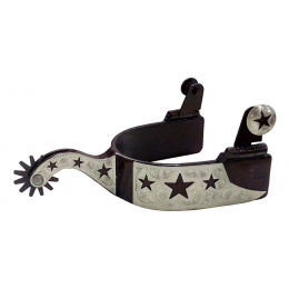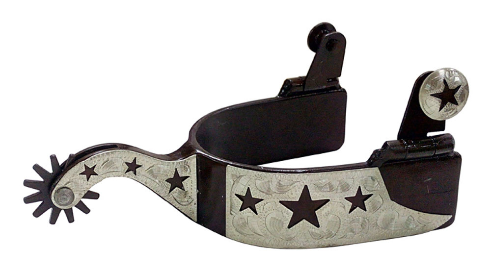 Hnědé ocelové ostruhy s ručně rytým stříbrným zdobením. Kolečko s dvanácti paprsky.