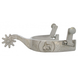 Nerezové show ostruhy s ručně rytým zdobením s motivem "reiner". Se stopkou ve tvaru labutího krku a kolečkem s deseti paprsky.