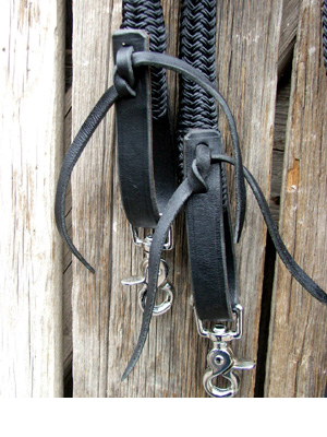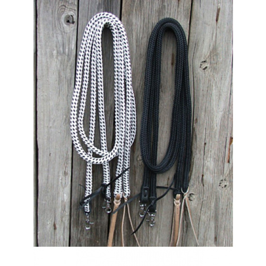 Otěže z oblíbeného materiálu, dostatečně těžké pro výcvik vašeho koně. Velmi ohebné a příjemné do ruky. Můžete zvolit upevnění otěží do udidla na karabiny, nebo na kožené koncovky..