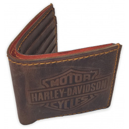 Luxusní, ručně šitá kožená peněženka s vytlačenými logy Harley Davidson.