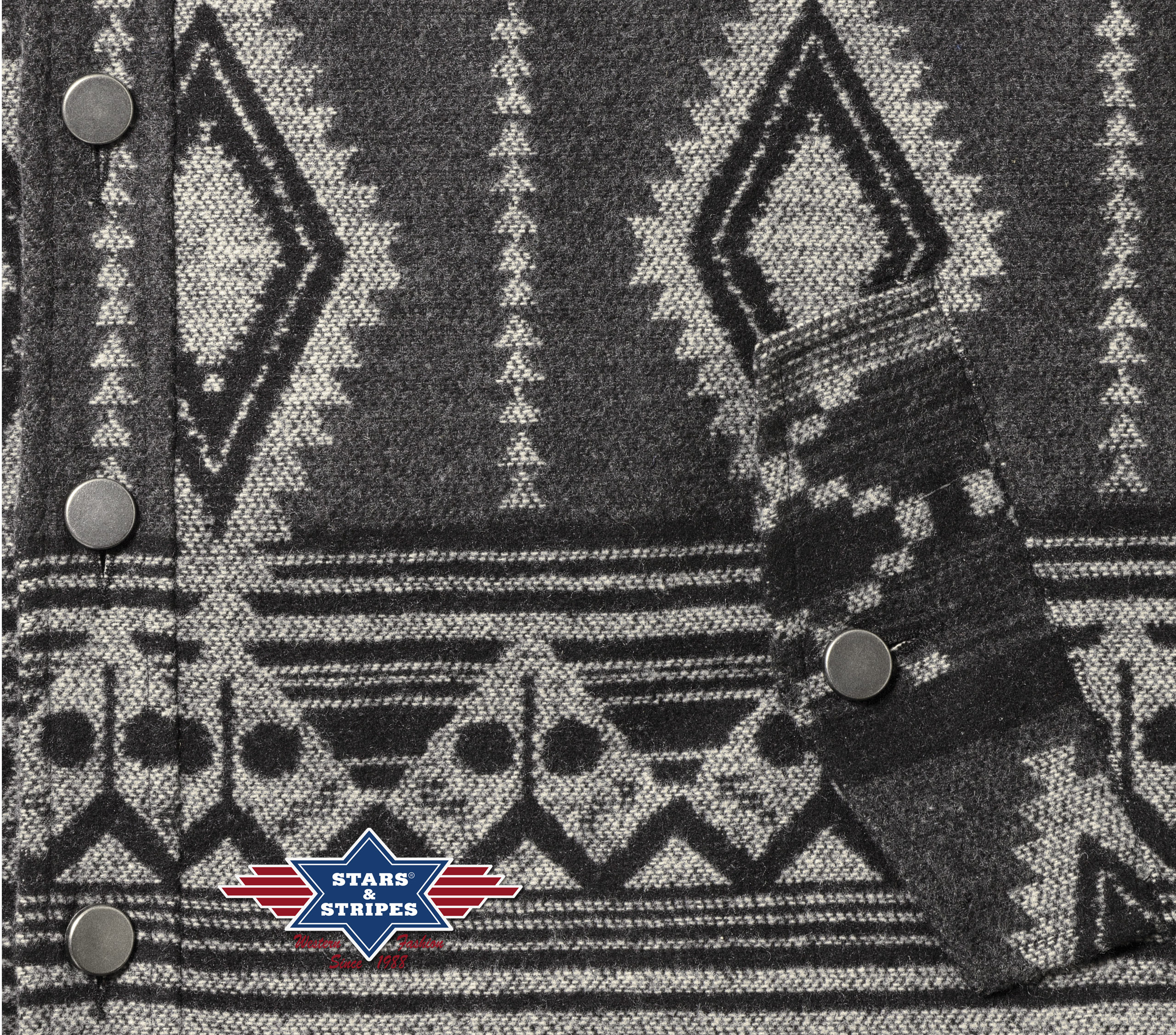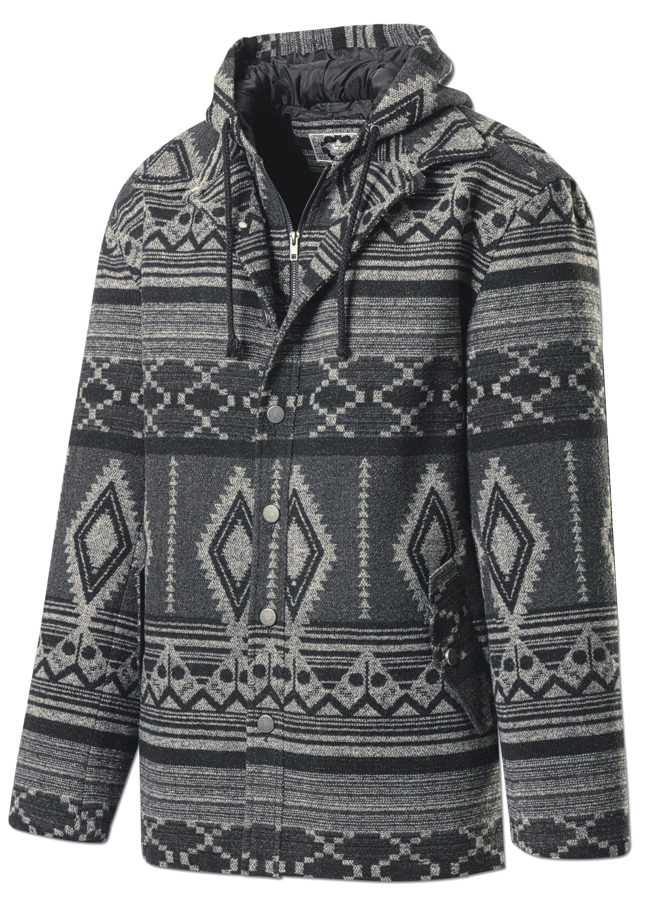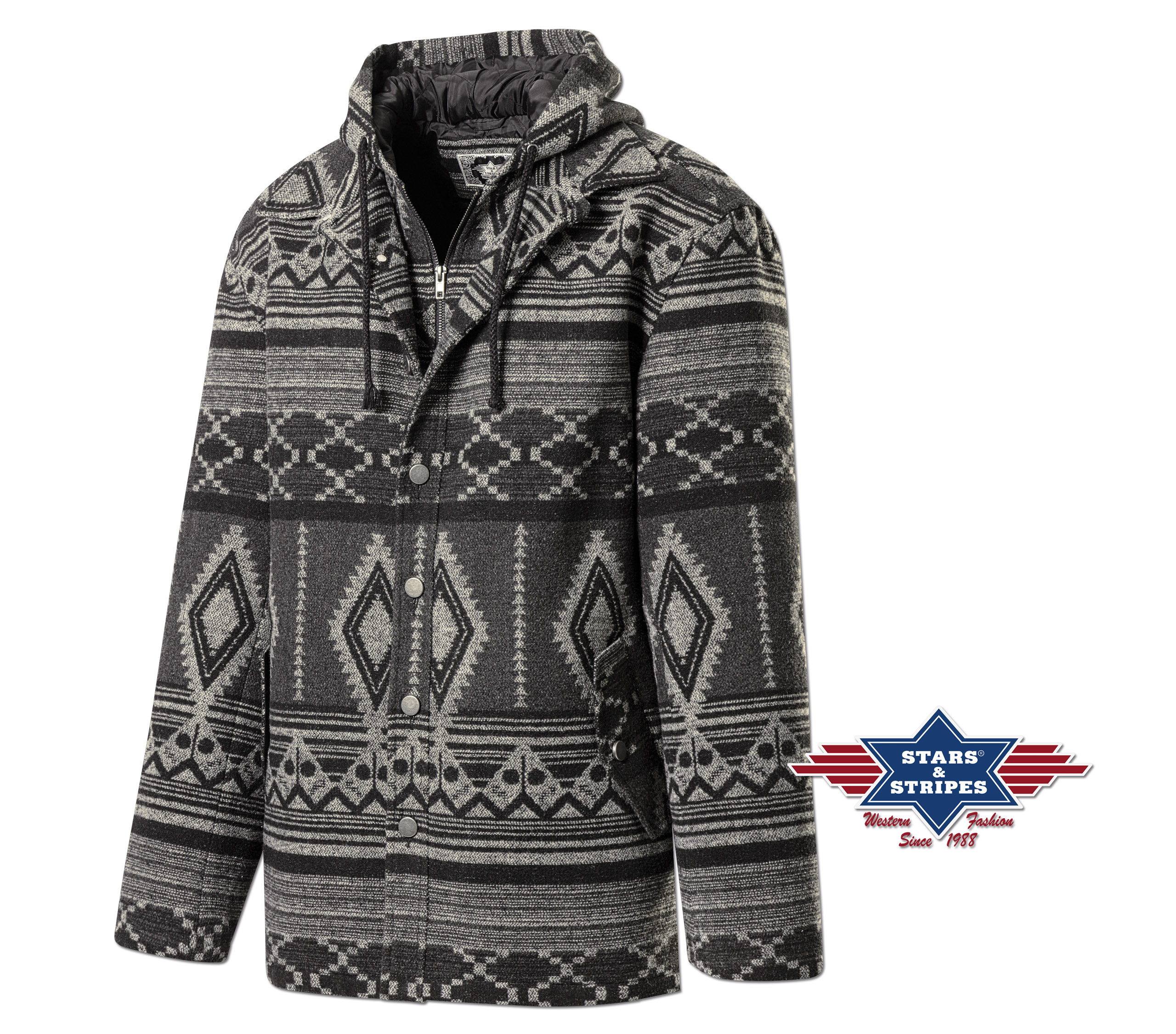 Stylová pánská bunda s kapucí a prošívanou podšívkou, vnější vzhled s aztéckými motivy. Zapínání na zip, který je překrytý klopou s knoflíky. Vnější kapsy s klopou na knoflík a jedna vnitřní kapsa.