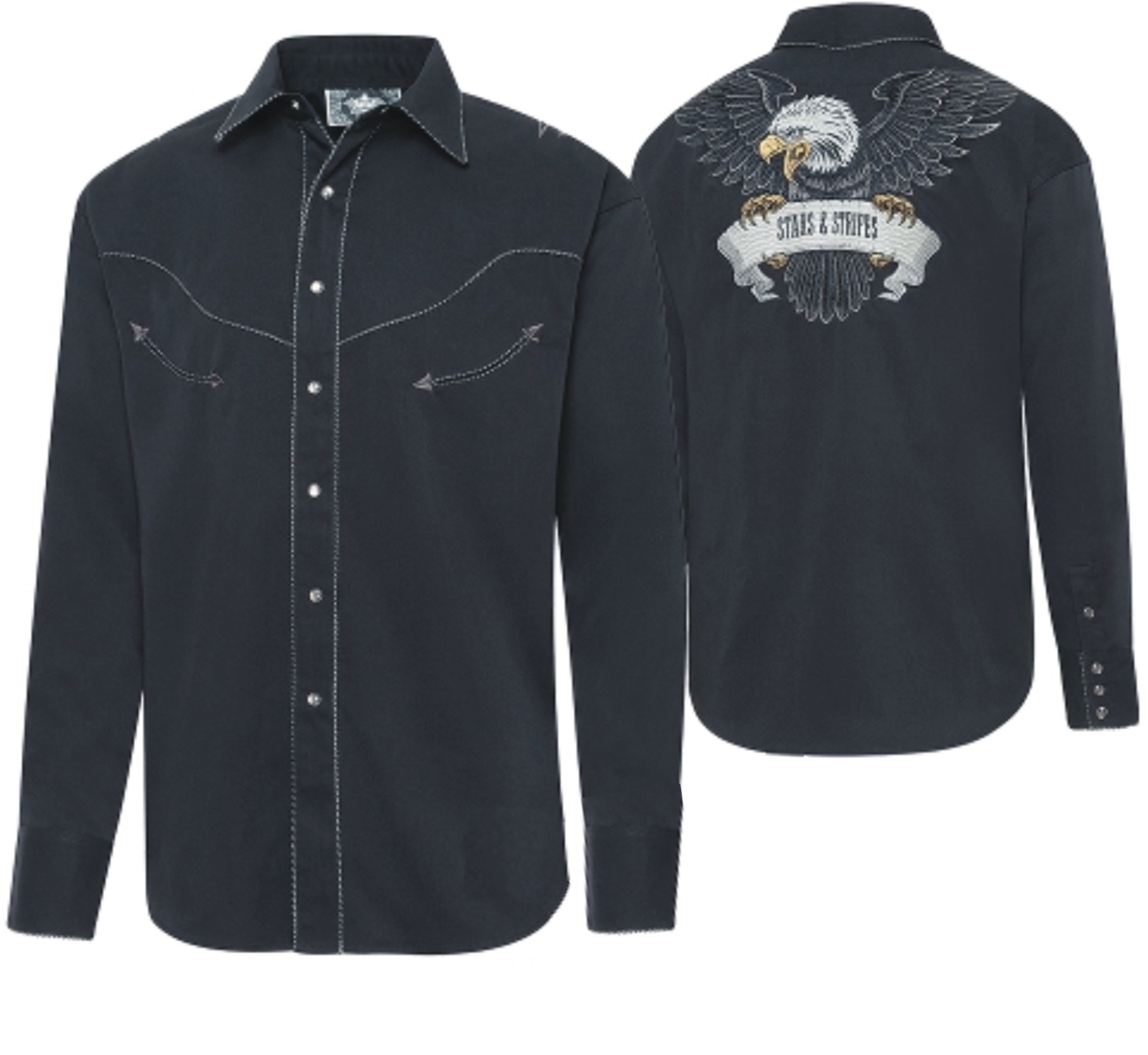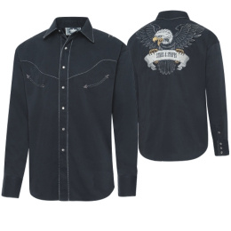 Stylová černá košile s kontrastním westernovým sedlem a náprsními kapsami. Design doplňuje lem límečku klopy, stylové druky a luxusní výšivka orla na zádech.