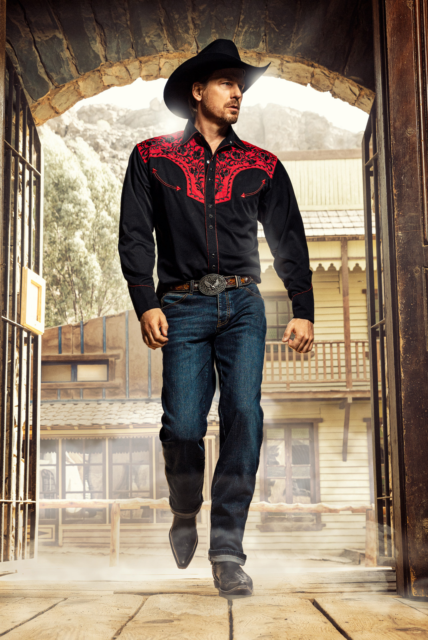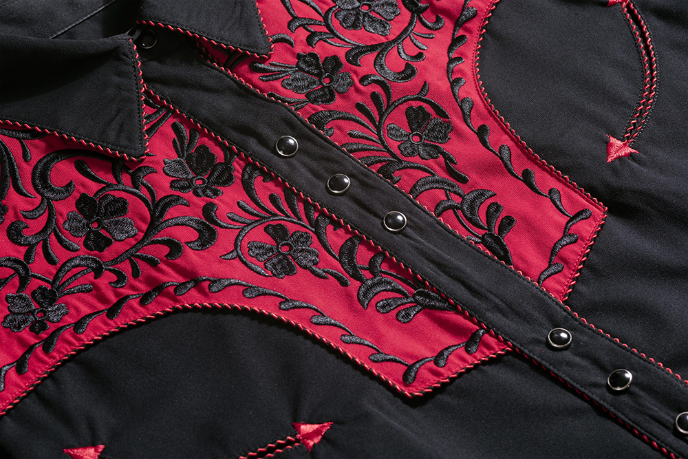 Nádherná černá westernová košile s červeným westernovým sedlem a exkluzívní výšivkou na hrudi a zádech. Design doplňuje dvoubarevné lemování a stylové knoflíčky na manžetách. Do páru lze sladit s dámskou halenkou Dolly.