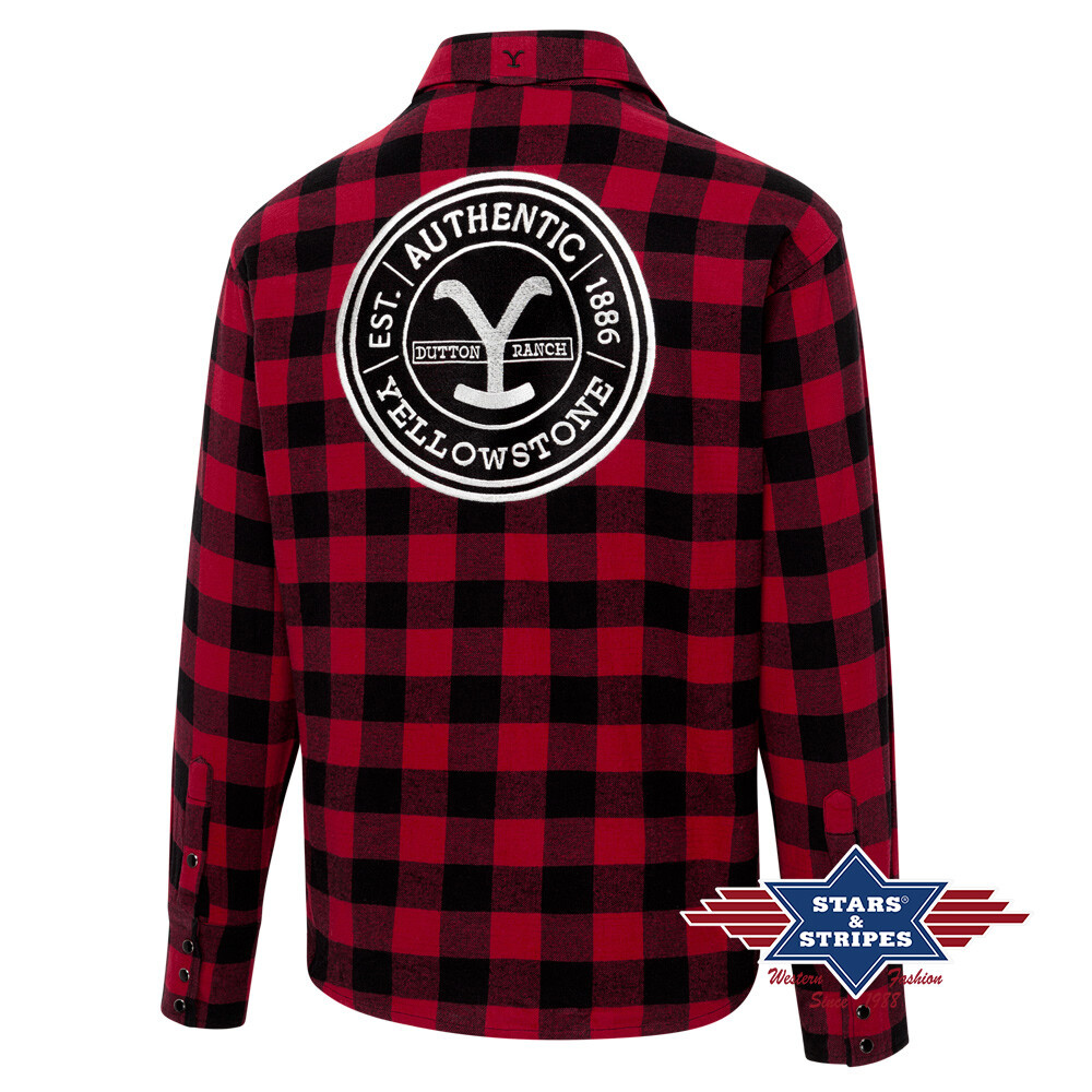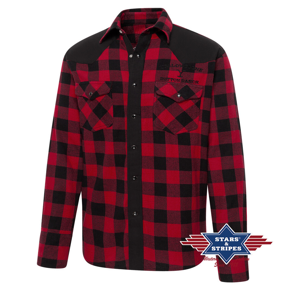 Pánská karovaná košile s westernovým sedlem z nové kolekce Yellowstone se stylovým motivem vyšitým na zádech. Zvýraznění stylu dopomáhá lemování falešných náprsních kapes a švů a stylové knoflíkové druky.