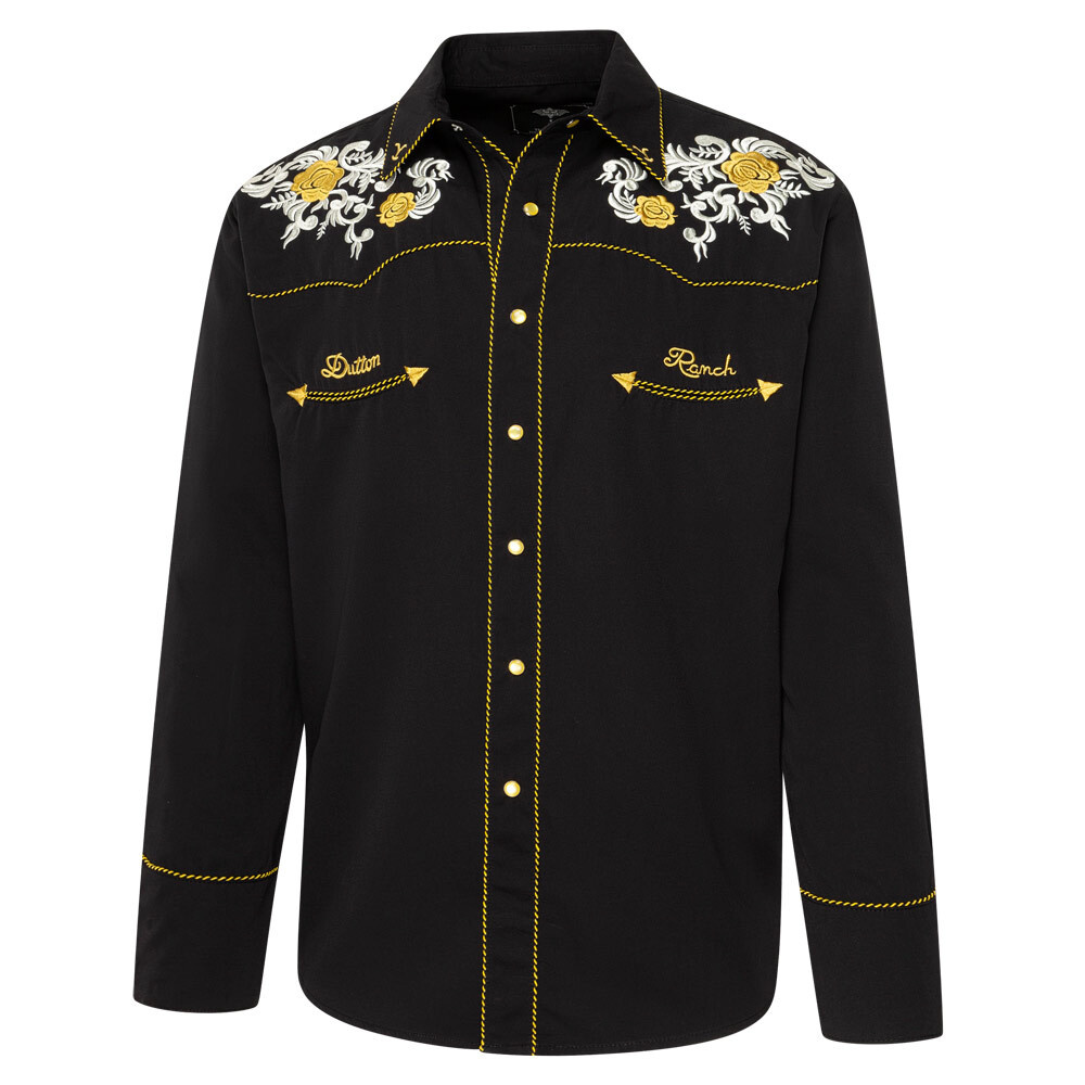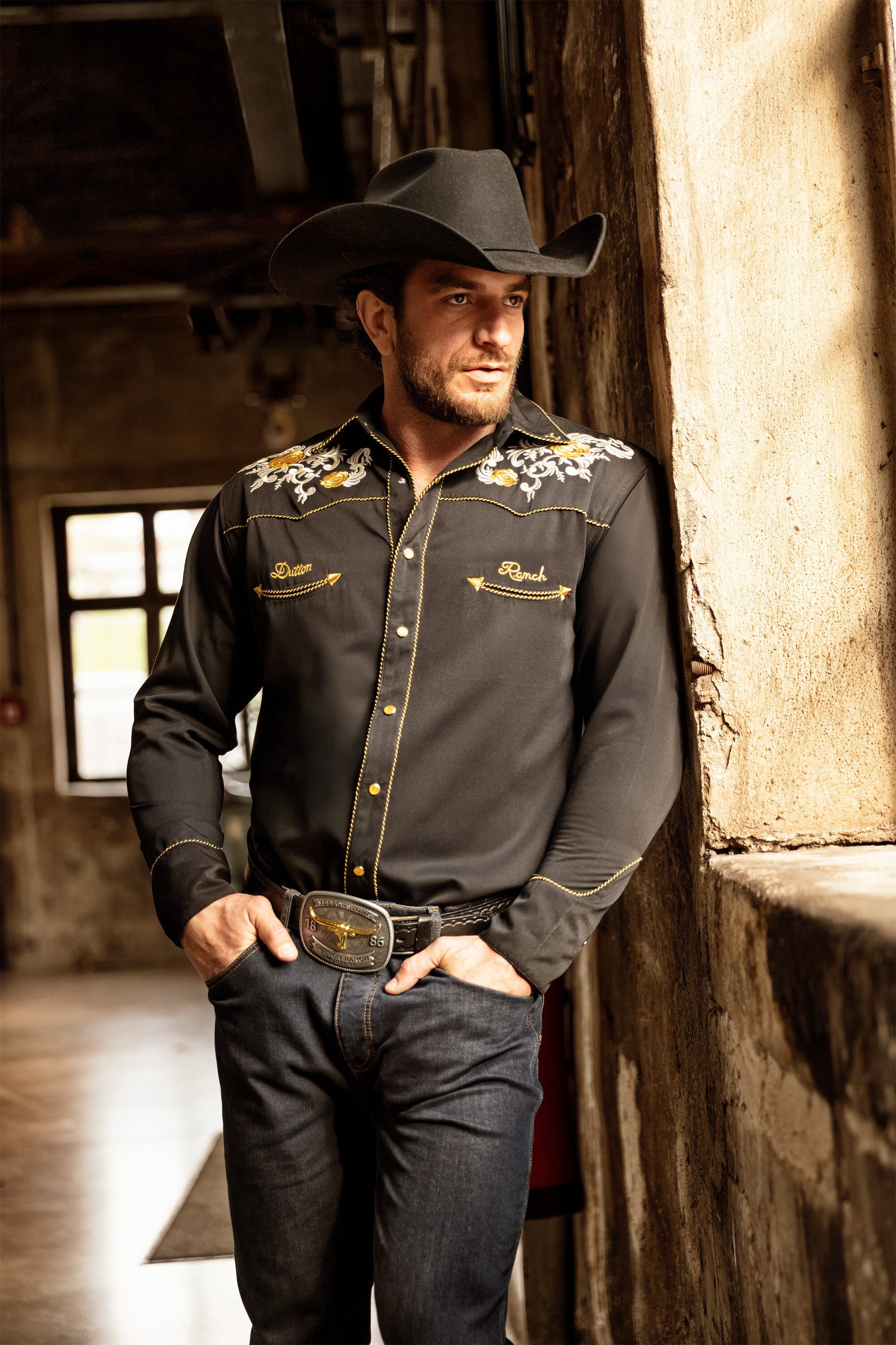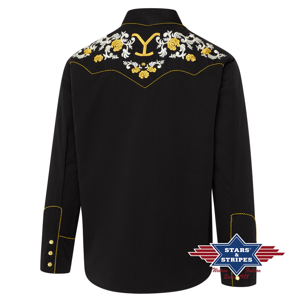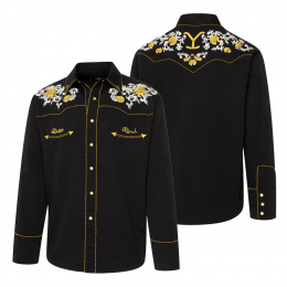 Pánská košile s westernovým sedlem z nové kolekce Yellowstone s květinovým motivem vyšitým na ramenou a zádech. Zvýraznění stylu dopomáhá lemování falešných náprsních kapes a švů a stylové knoflíkové druky. Do páru s dámskou košilí Nova.