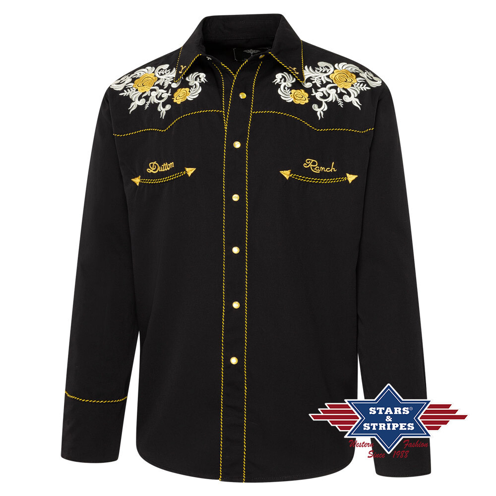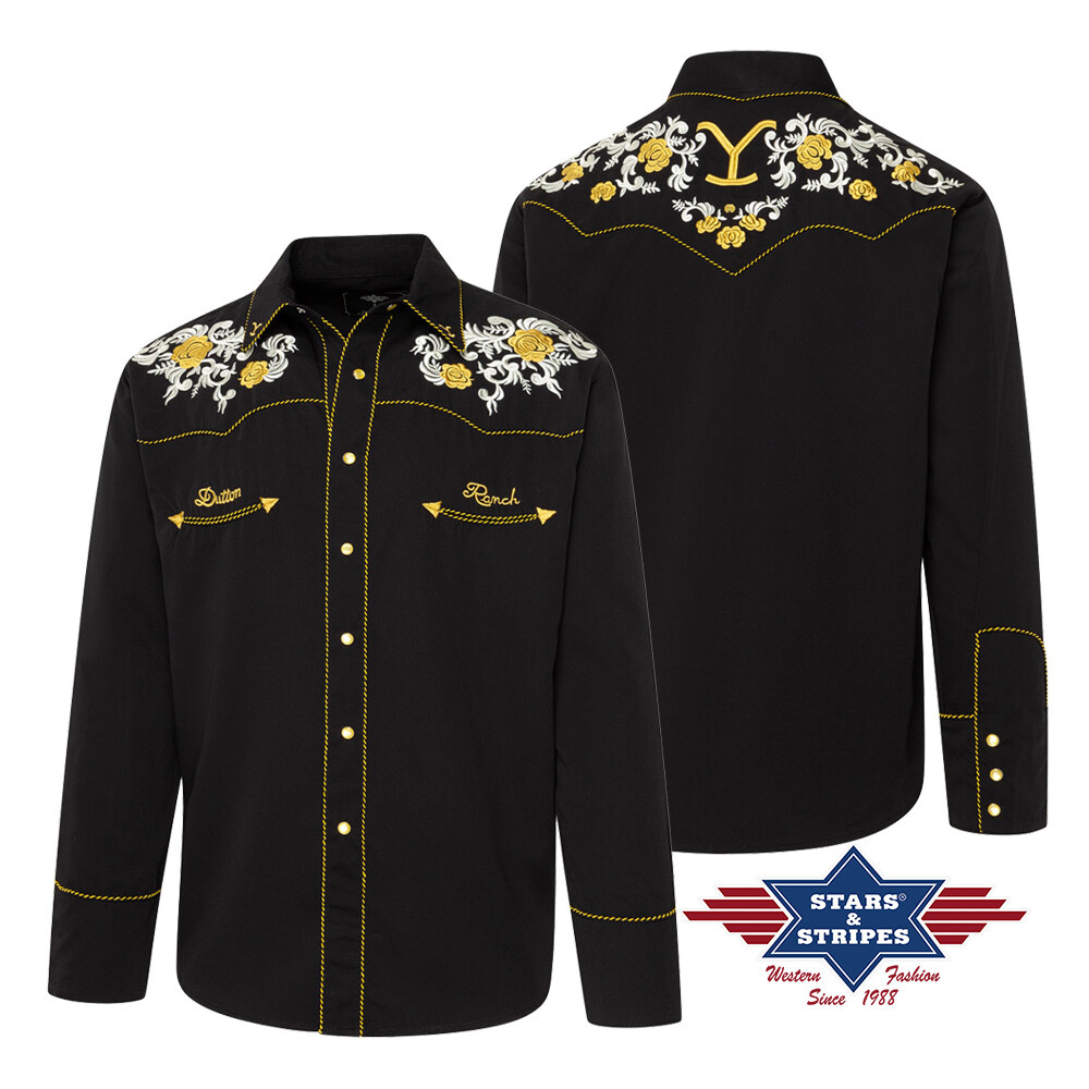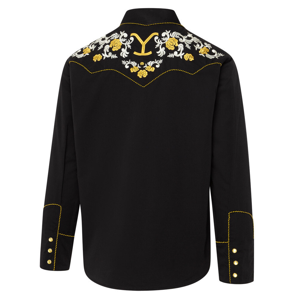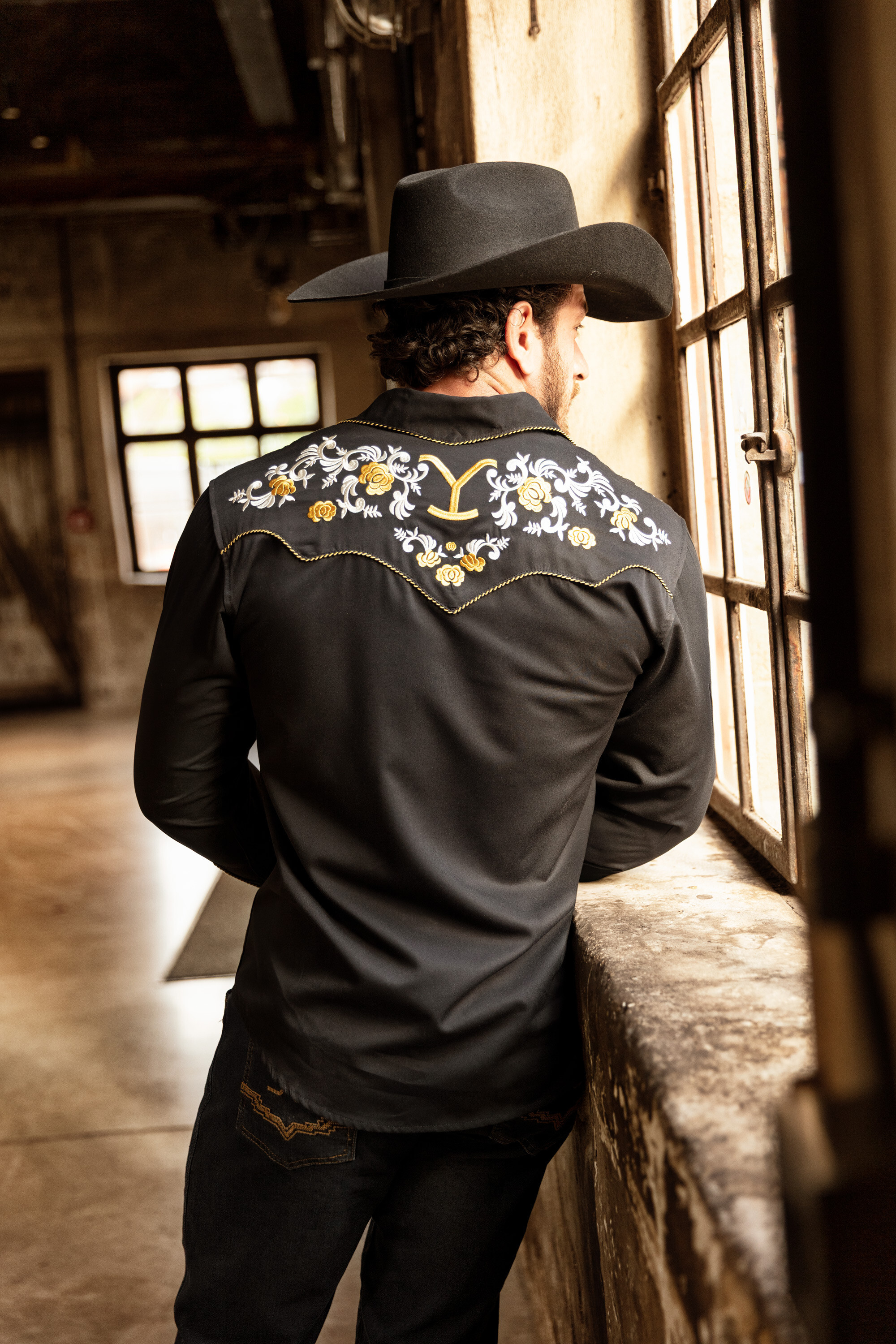 Pánská košile s westernovým sedlem z nové kolekce Yellowstone s květinovým motivem vyšitým na ramenou a zádech. Zvýraznění stylu dopomáhá lemování falešných náprsních kapes a švů a stylové knoflíkové druky. Do páru s dámskou košilí Nova.