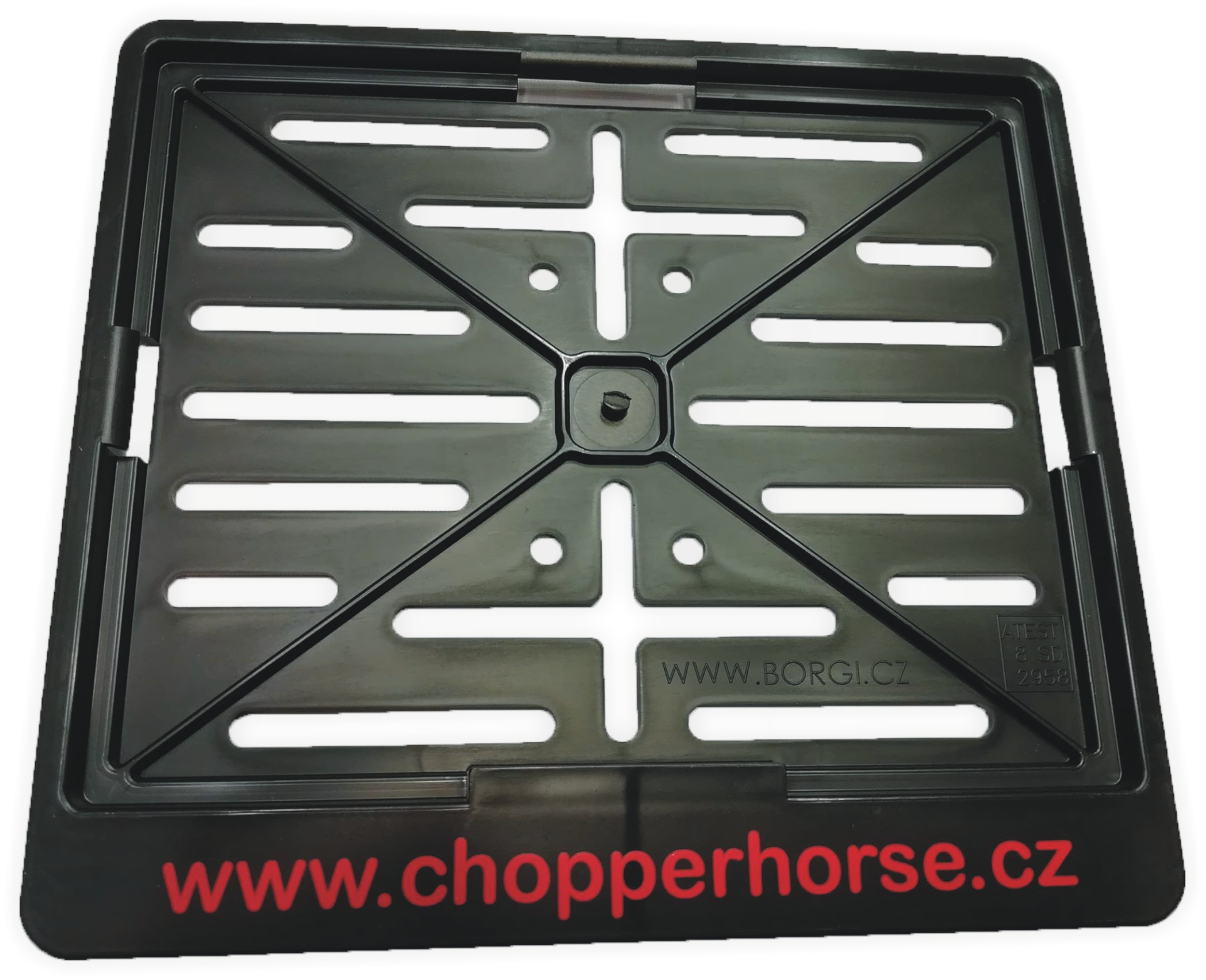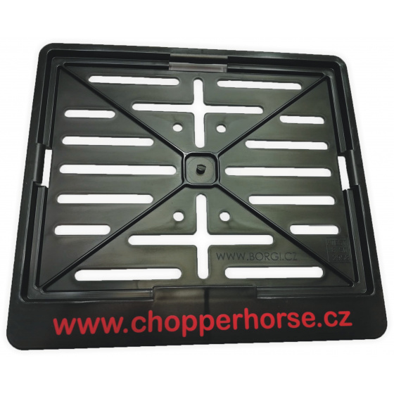 Plastová podložka pod SPZ nebo registrační značku pro motocykl s nápisem Chopper-horse shop na spodním okraji. Podložka je vybavena otvory pro univerzální osazení na jakýkoliv motocykl.