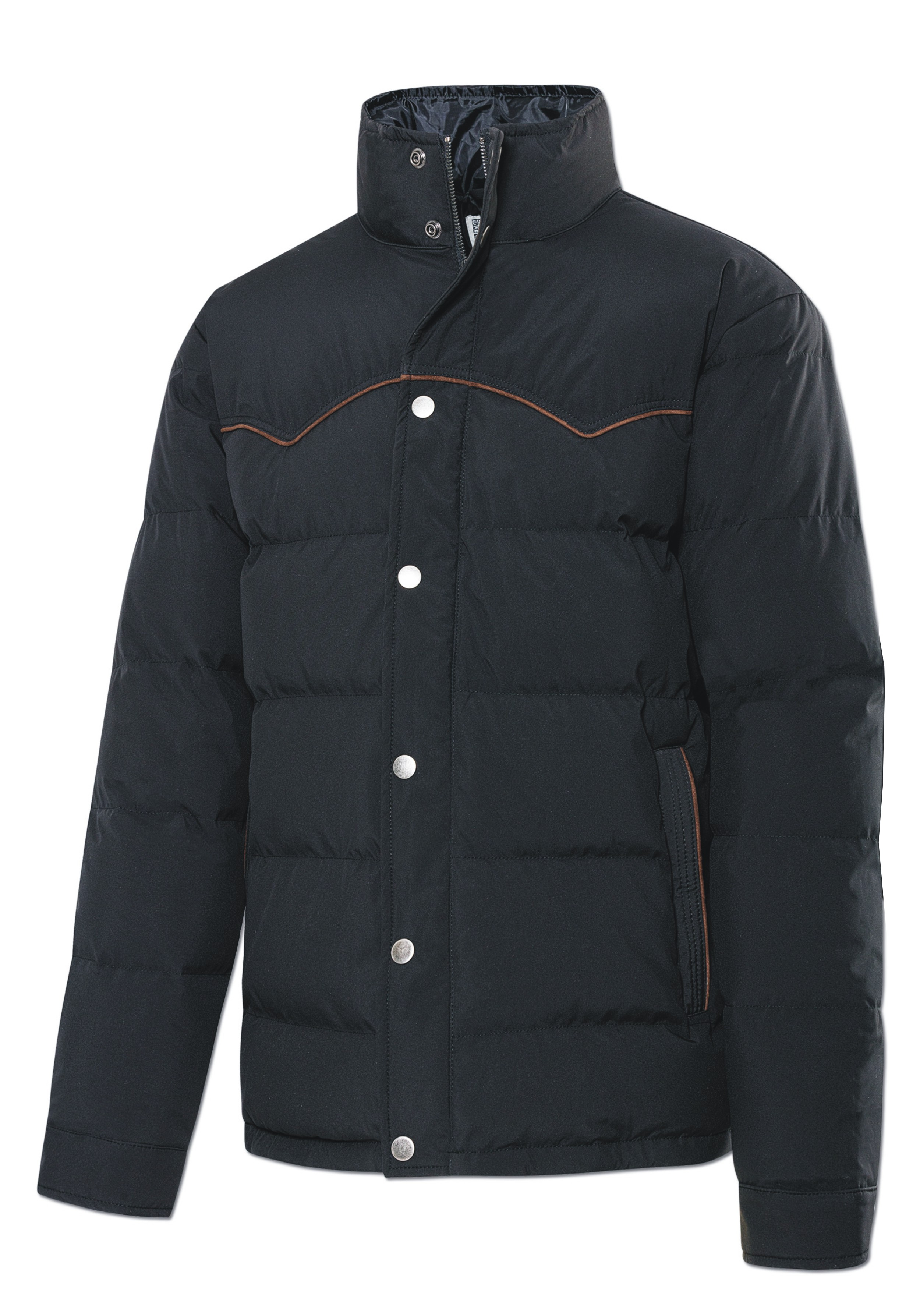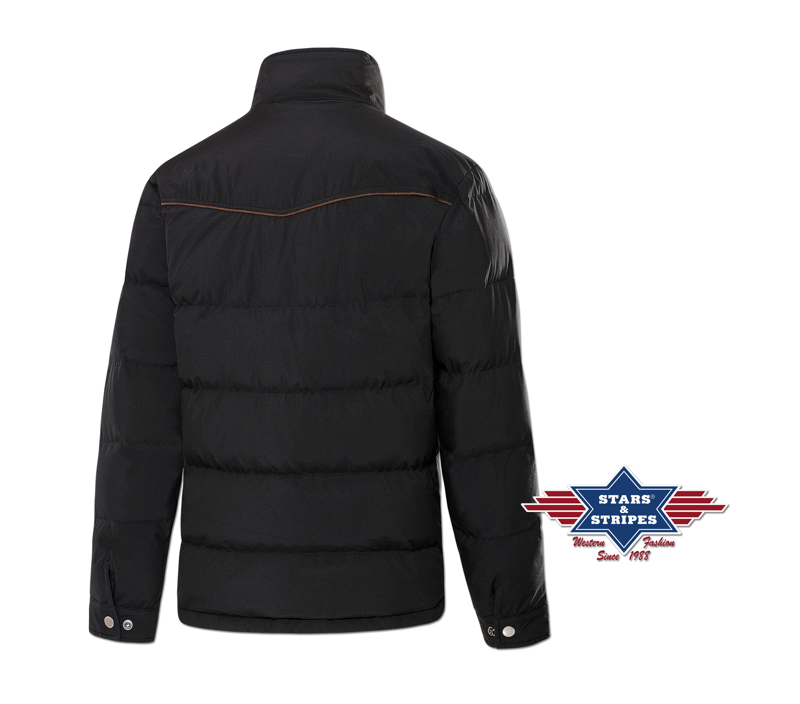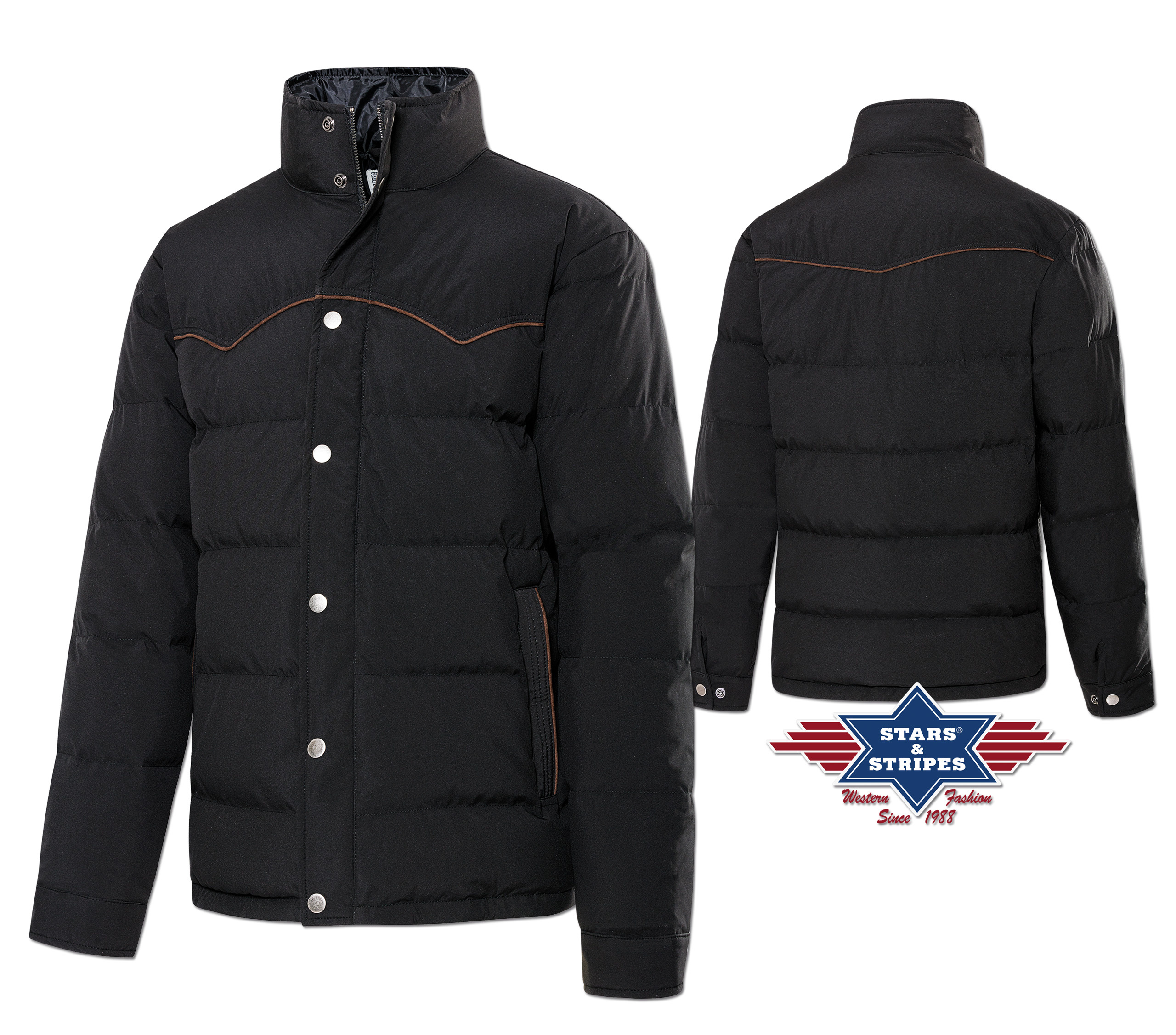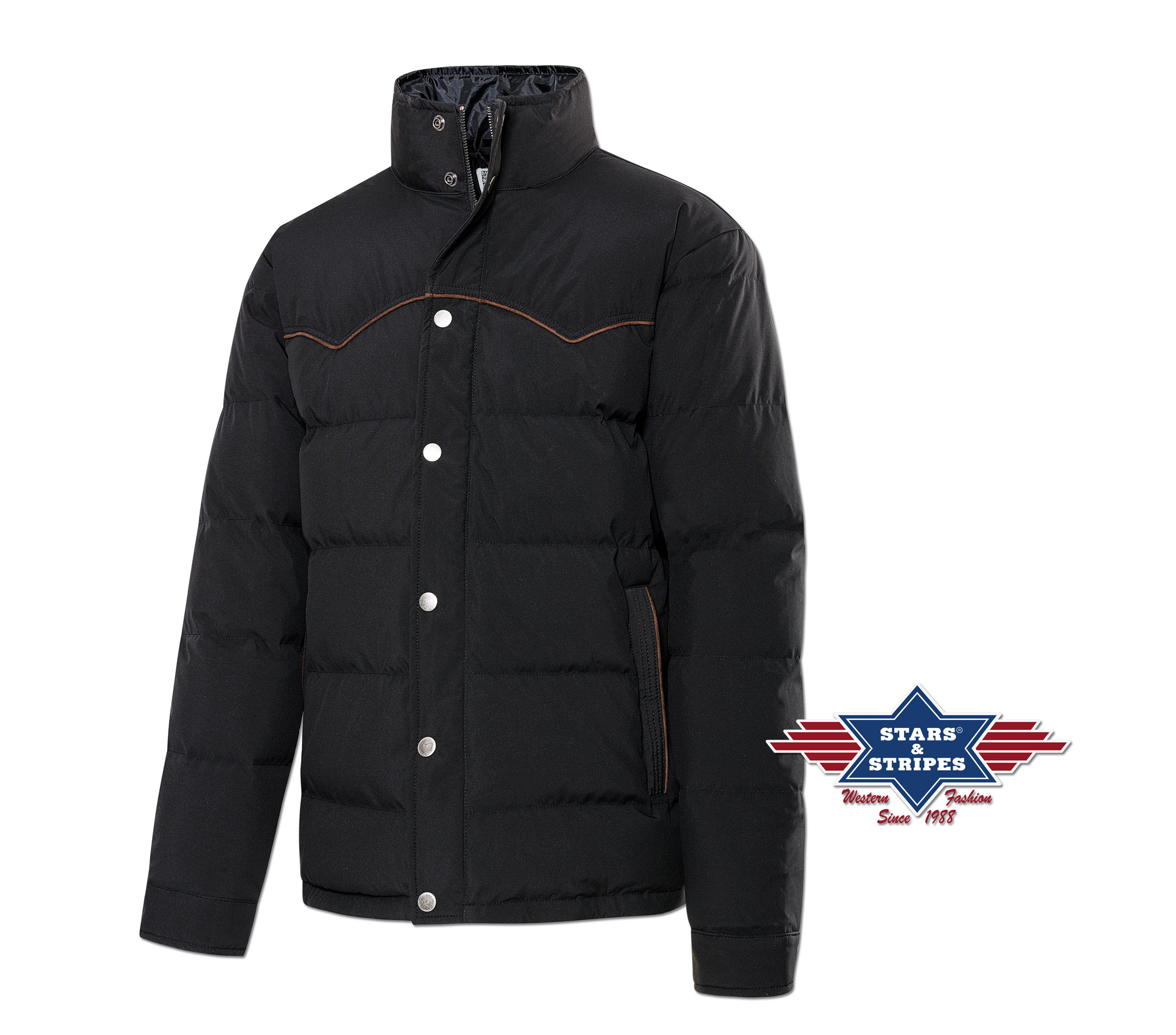 Prošívaná zimní bunda zdobená stylovým westernovým sedlem. Zapínání na zip, který je překrytý klopou s druky. Dvě vnější kapsy a jedna vnitřní také zapínané zipem.