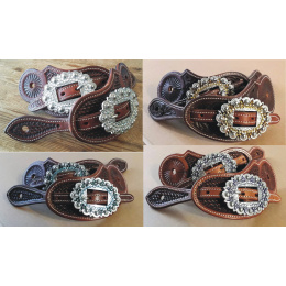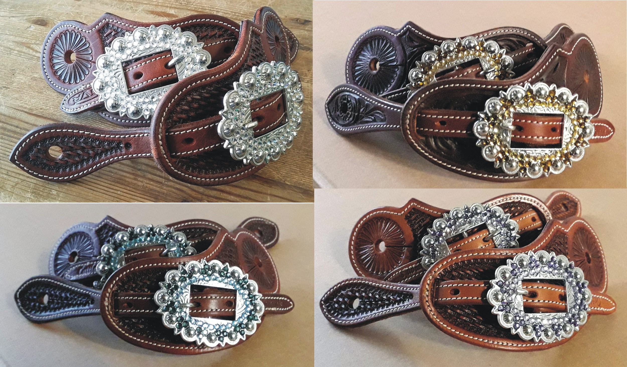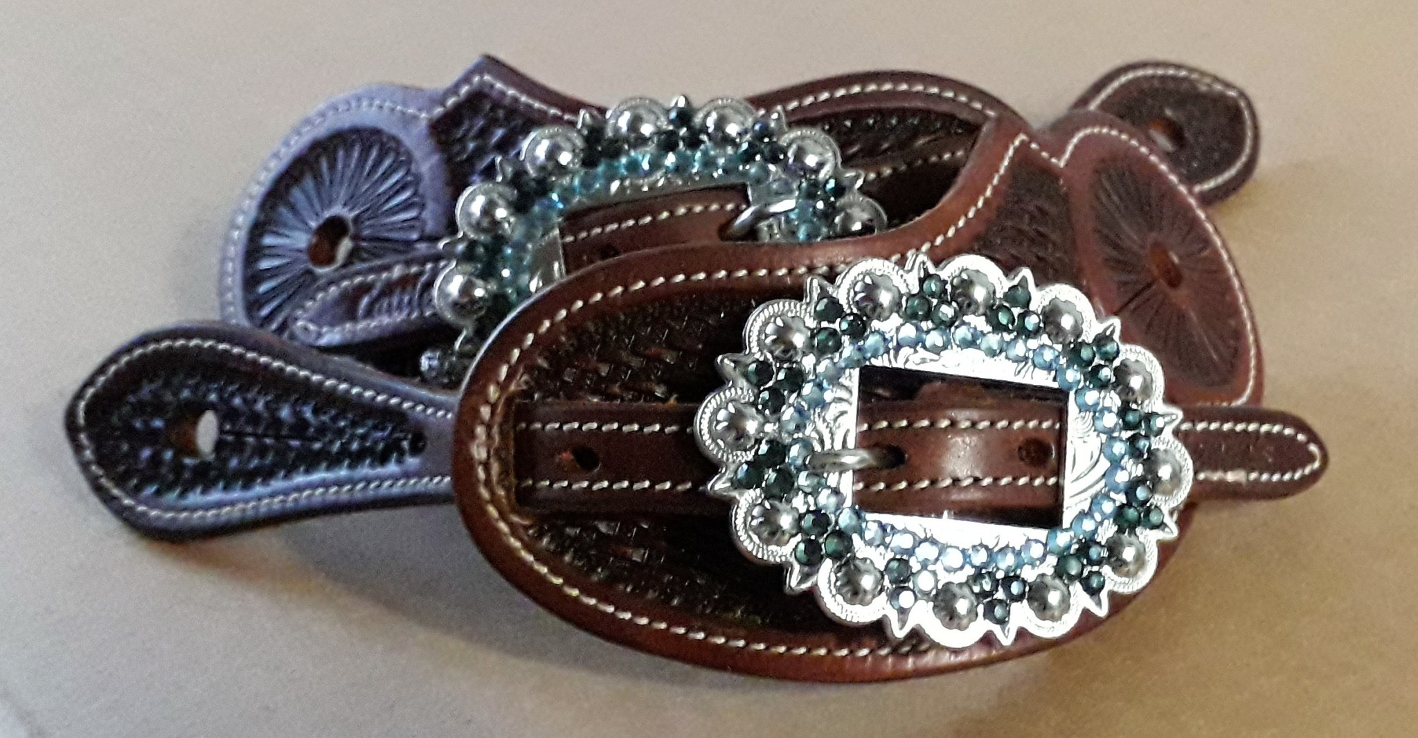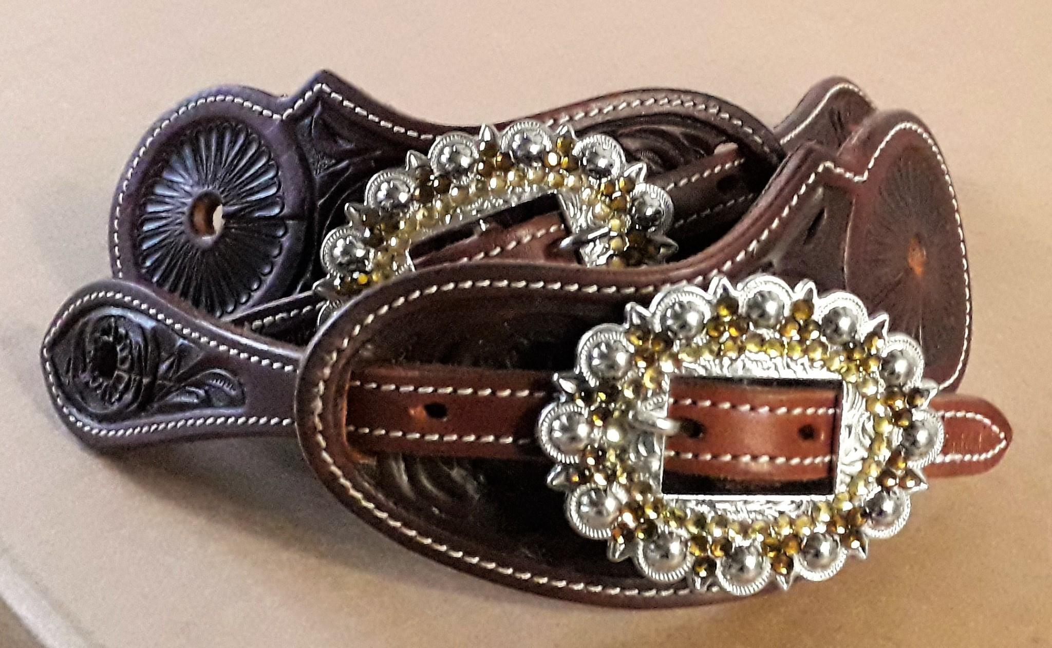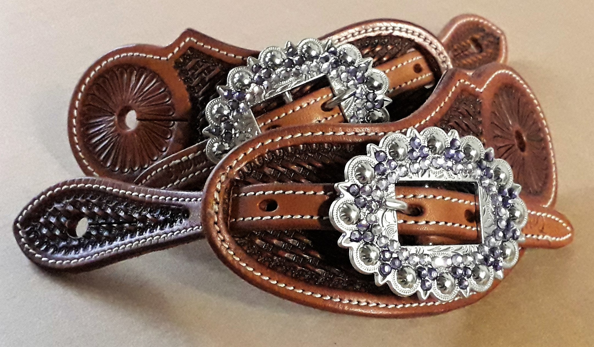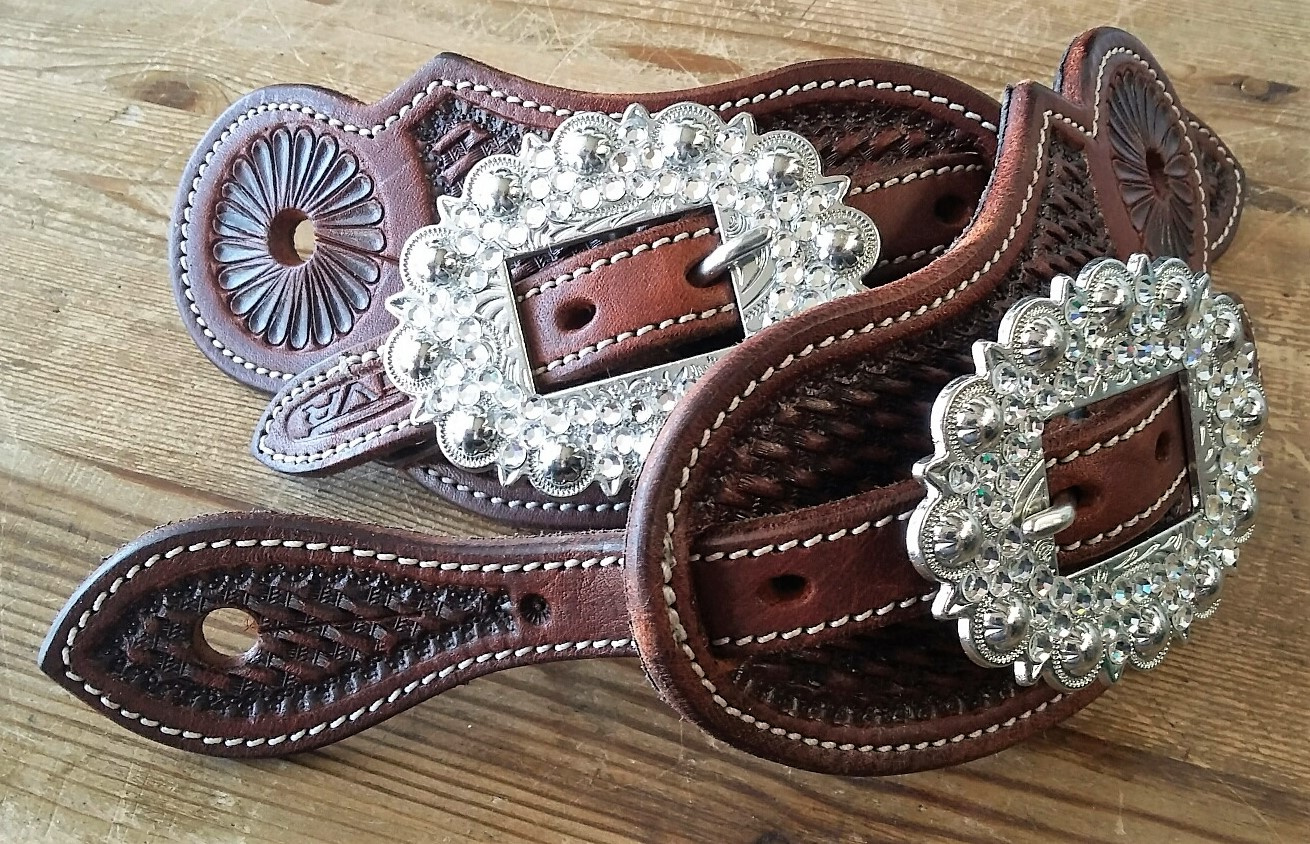 Westernové kožené řemínky k ostruhám zdobené basketem, se stříbrnou gravírovanou přezkou zdobenou kamínky.