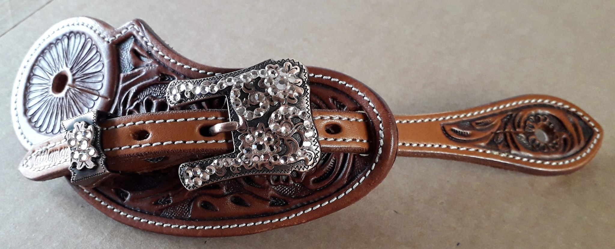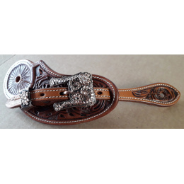 Westernové kožené řemínky k ostruhám zdobené basketem, se stříbrnou gravírovanou přezkou zdobenou kamínky v měděném nádechu.