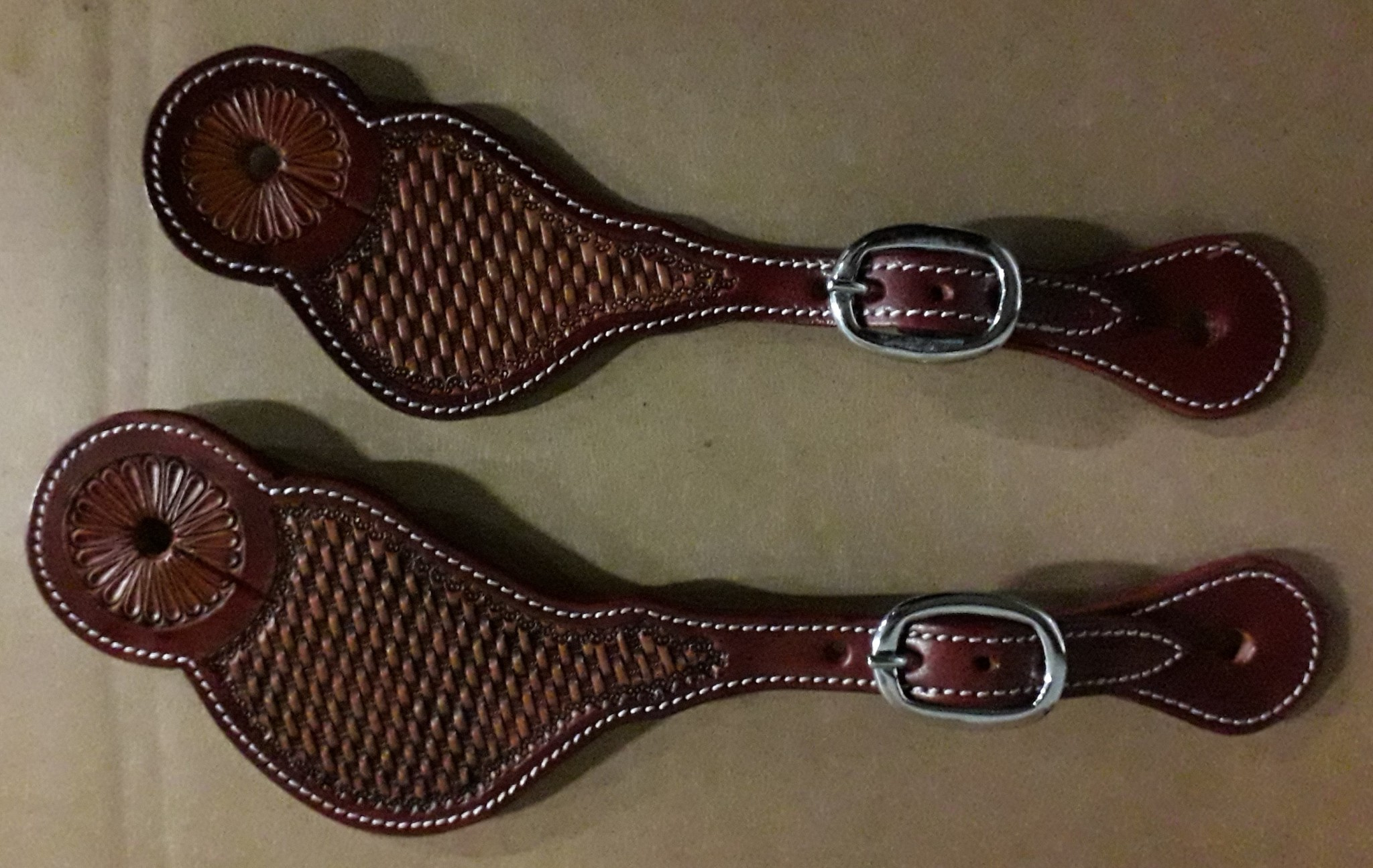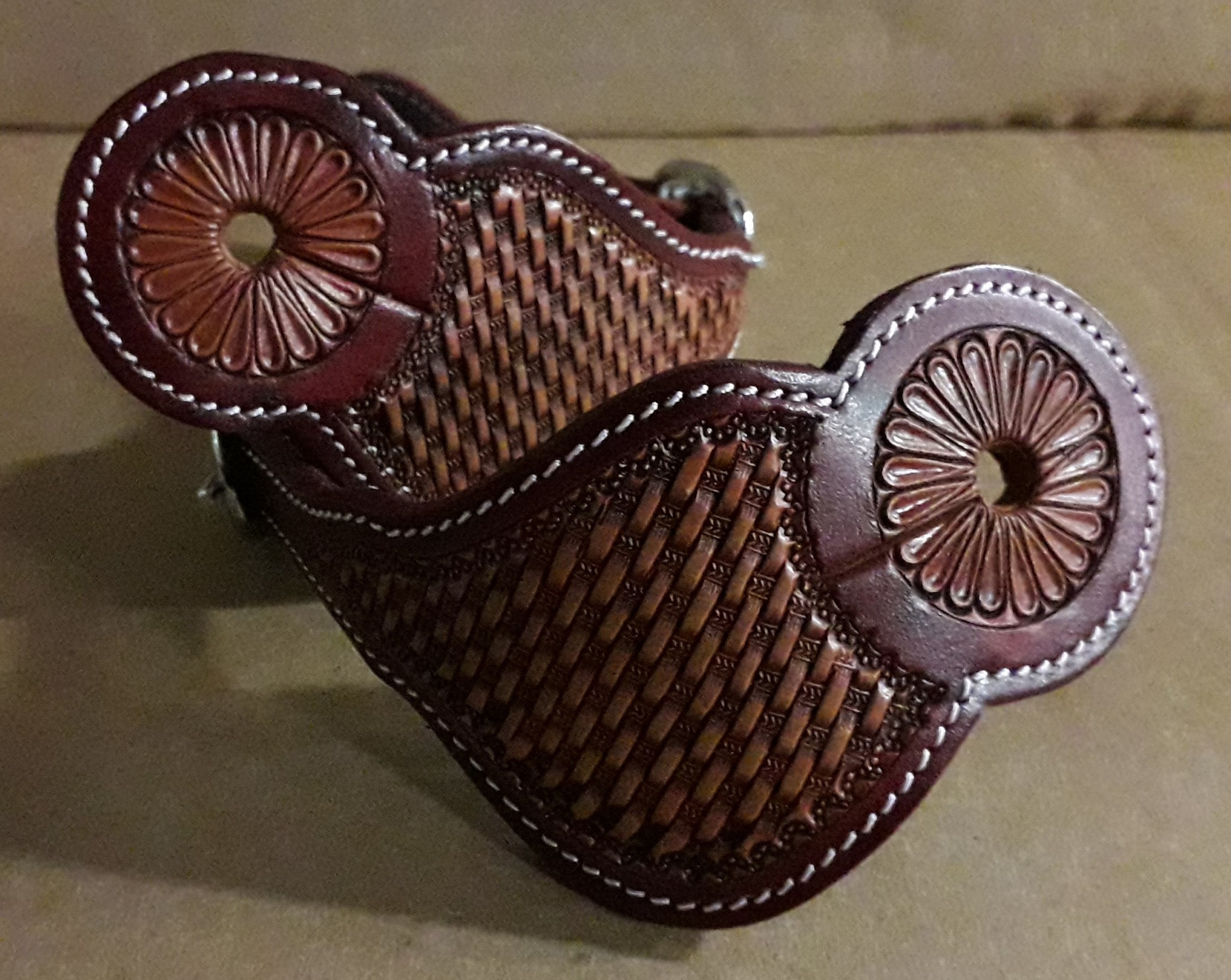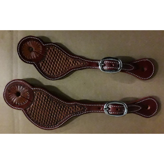 Westernové kožené řemínky k ostruhám zdobené basketem, nerezové kování.