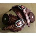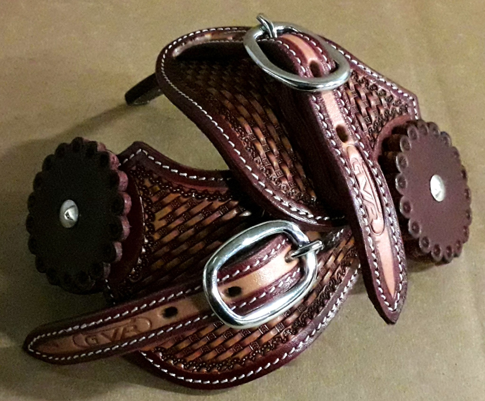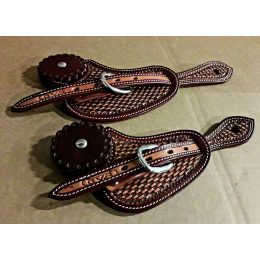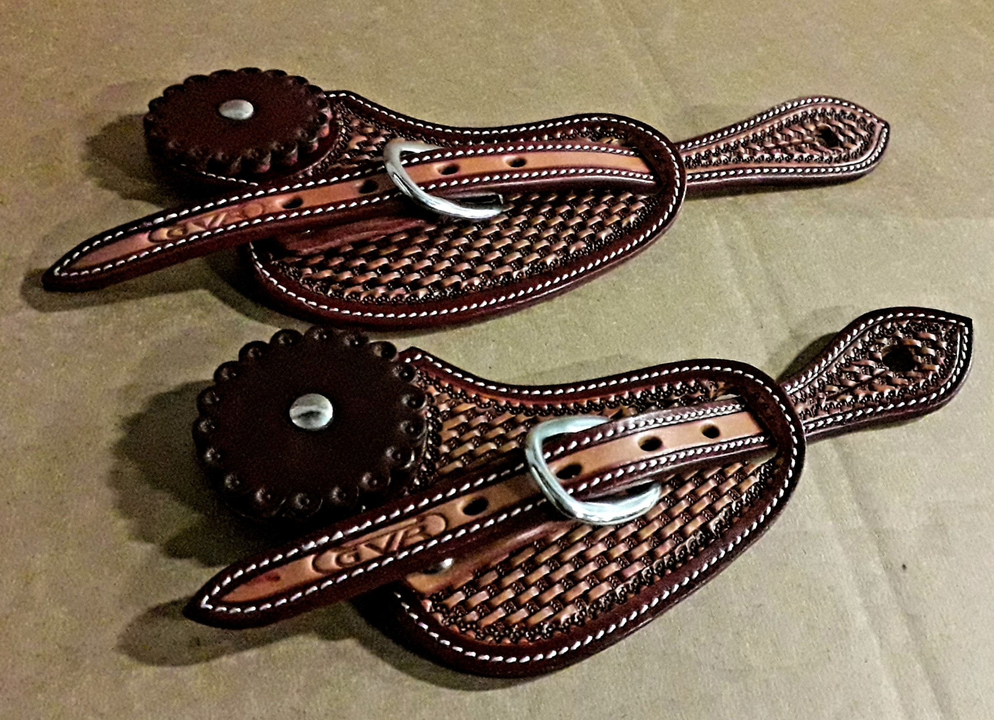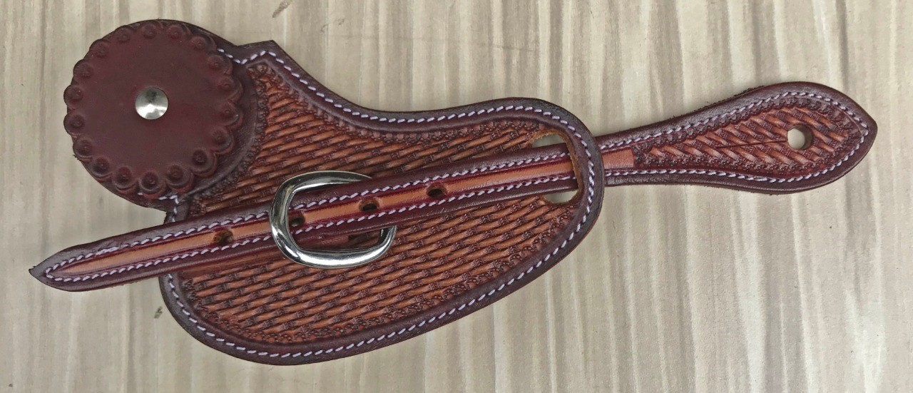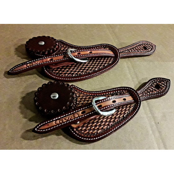 Westernové kožené řemínky k ostruhám zdobené basketem, nerezové kování.