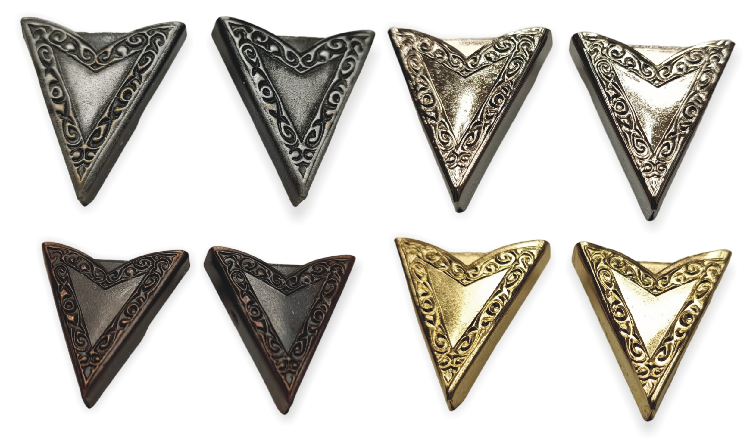 Provedení: stříbrná (poniklováno), matná stříbrná (starozinek), staroměděná, zlatá
