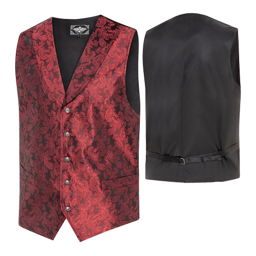 Luxusní westernová vesta zdobená paisley vzorem, se dvěma bočními kapsami a dekorativními knoflíky. Možnost úpravy velikosti pasu pomocí stahovacího proužku na zádové straně vesty.