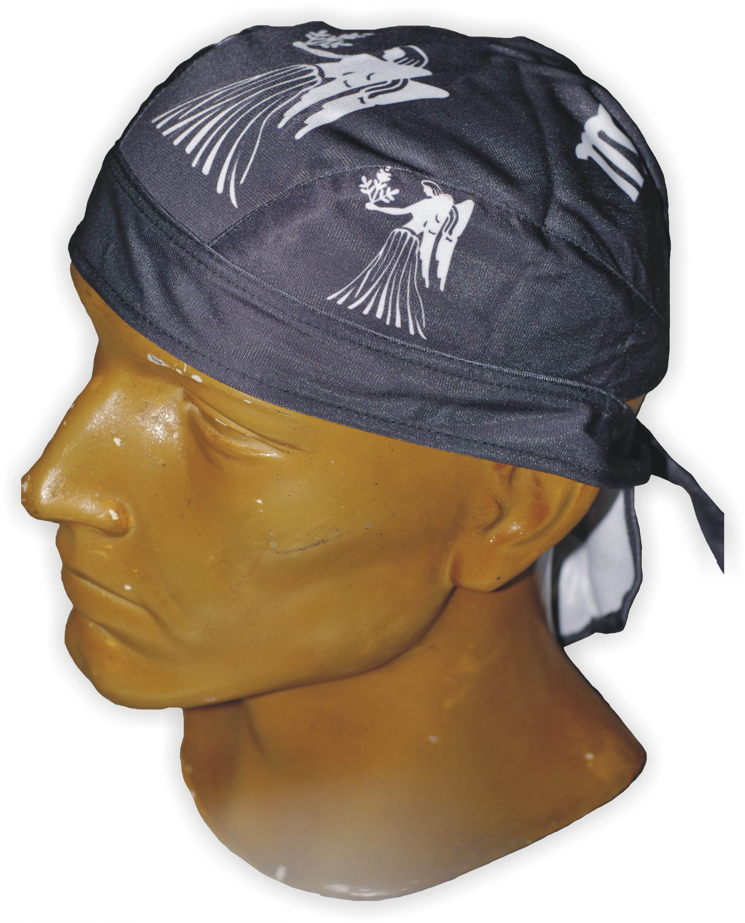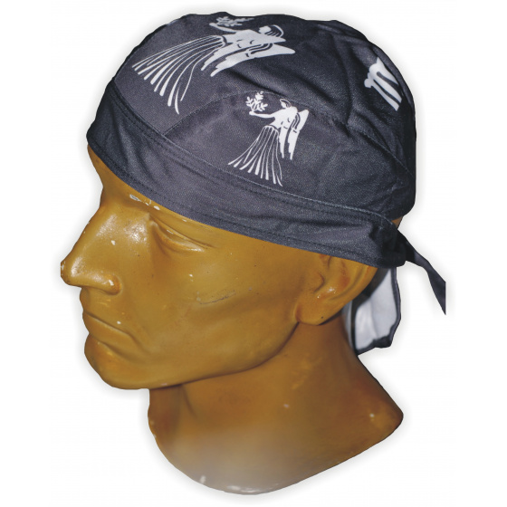 Šátek-čepička na hlavu se stylovým motivem.
