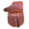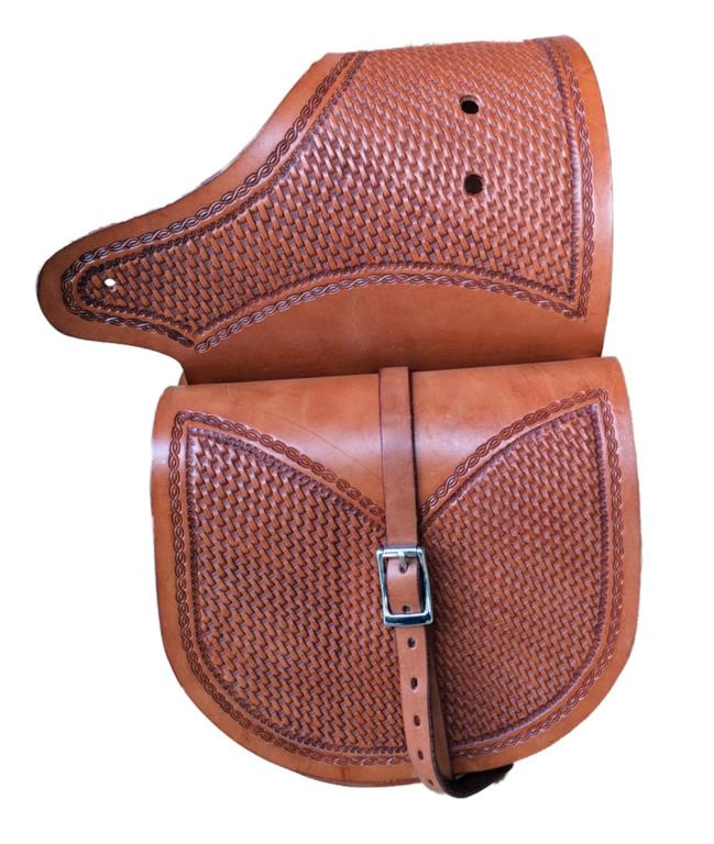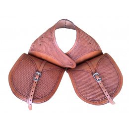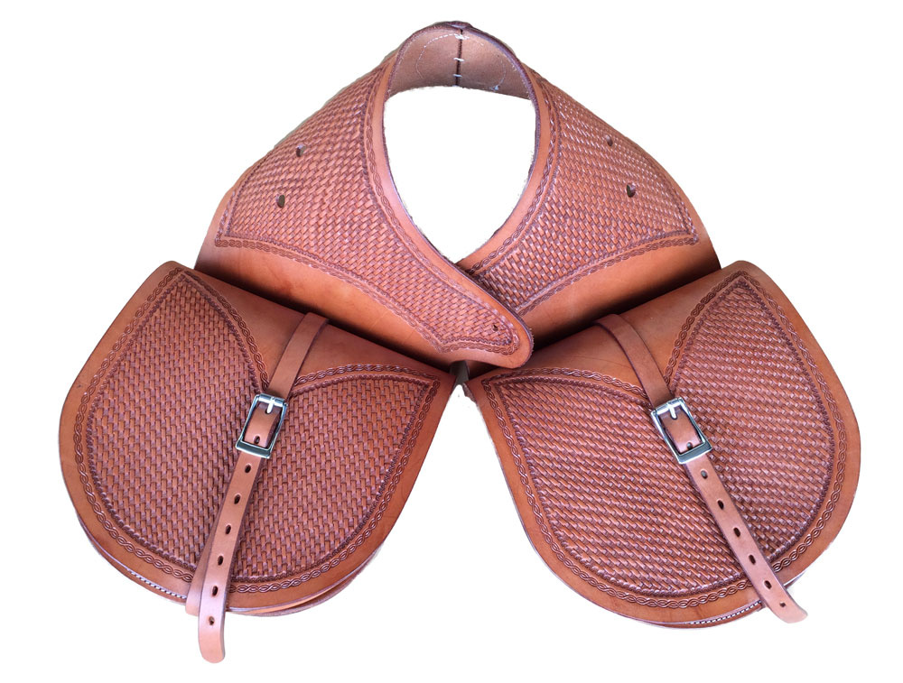 Brašny na westernové sedlo vyrobeny z prvotřídní kůže Sadesa zdobené basketem. Kování je z nerezové oceli, místo šroubů lze osadit ozdobnými končaky.