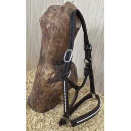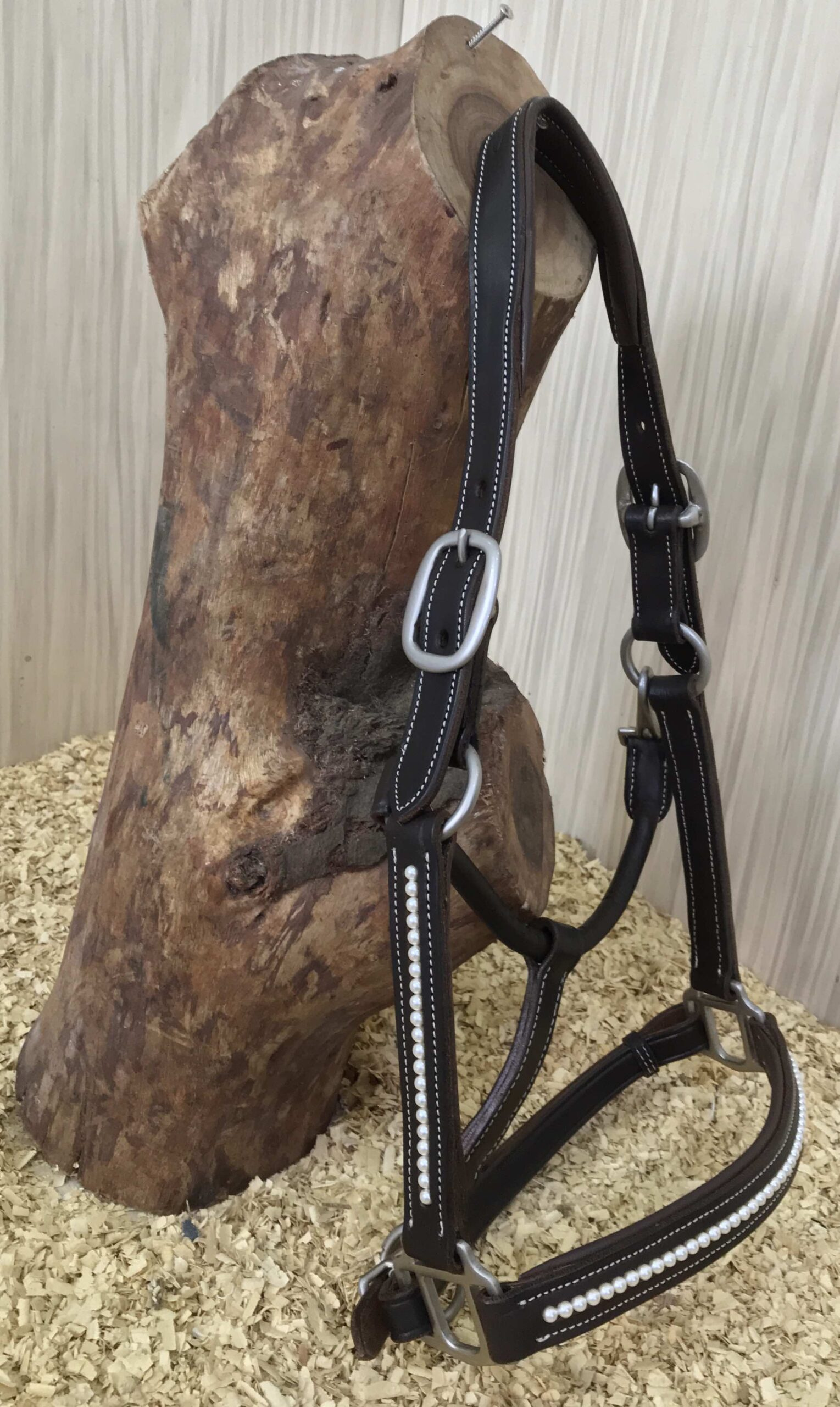 Kvalitní kožená show ohlávka zdobená perlami Swarowski, nastavitelná na obou stranách a nose.