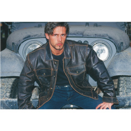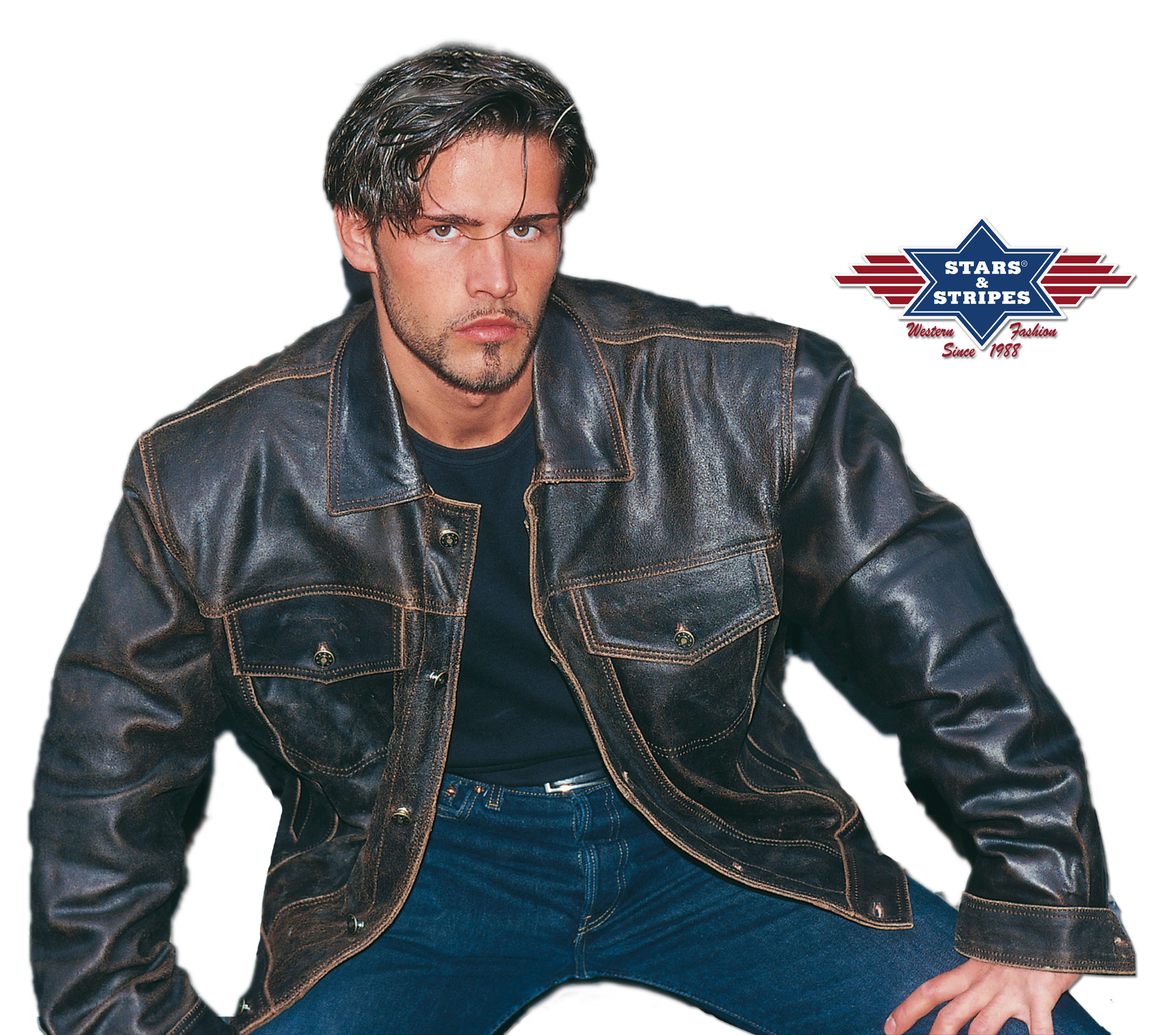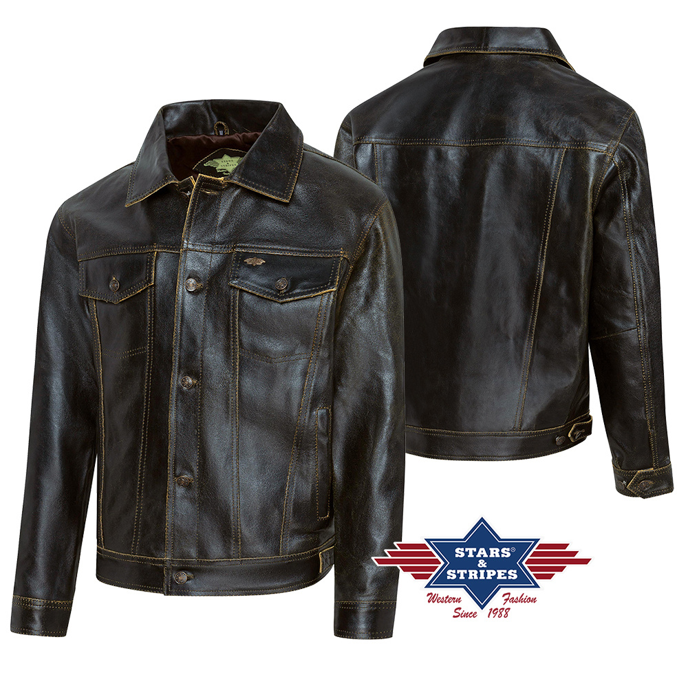 Robusní kožená bunda obnošeného vzhledu s patinou. Dvě boční kapsy, dvě náprsní kapsy s uzavíráním na knoflíky a dvě vnitřní kapsy. Klasický jeansový střih vás udělá neodolatelným.