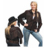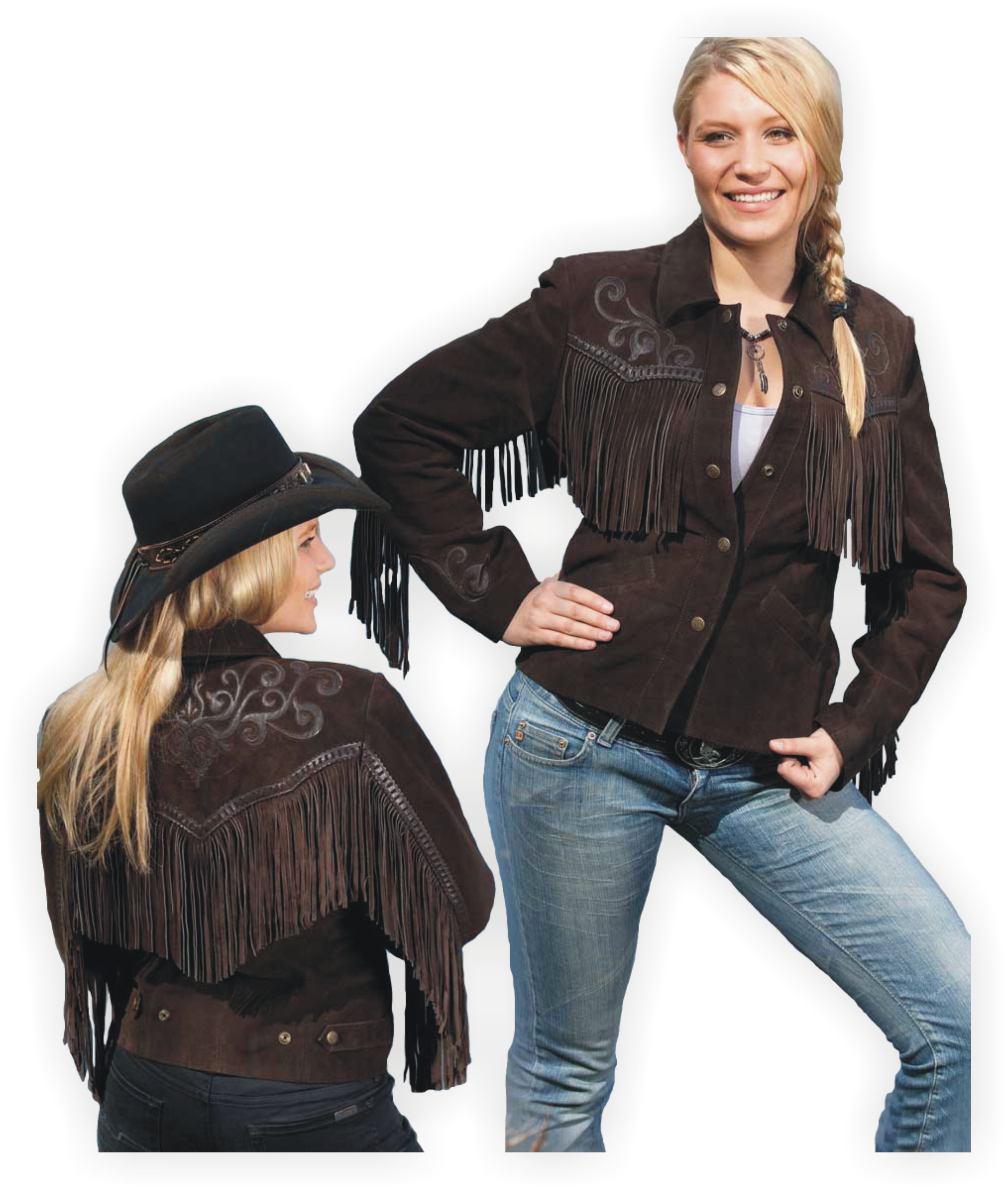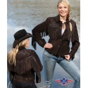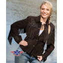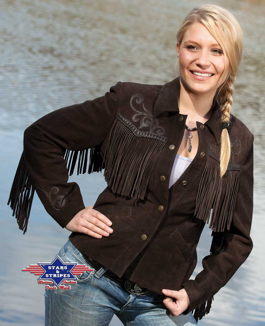 Elegantní dámská westernová bunda z hovězí kůže zdobená třásněmi, našitými vzory na zádech, ramenou a rukávech a kovovými druky.