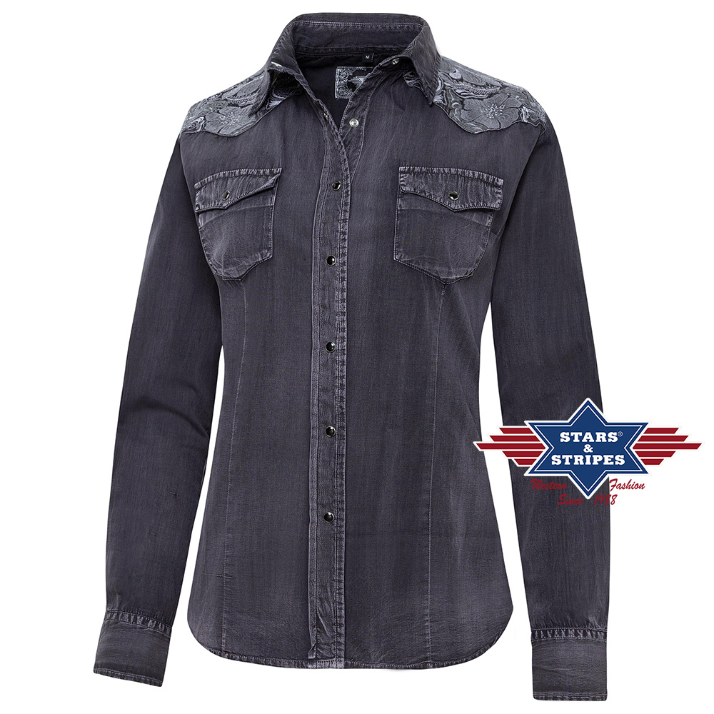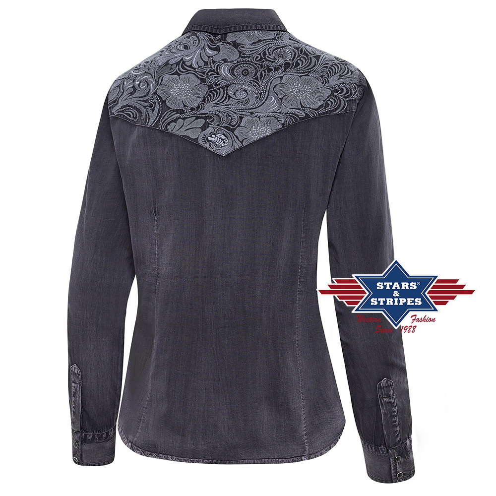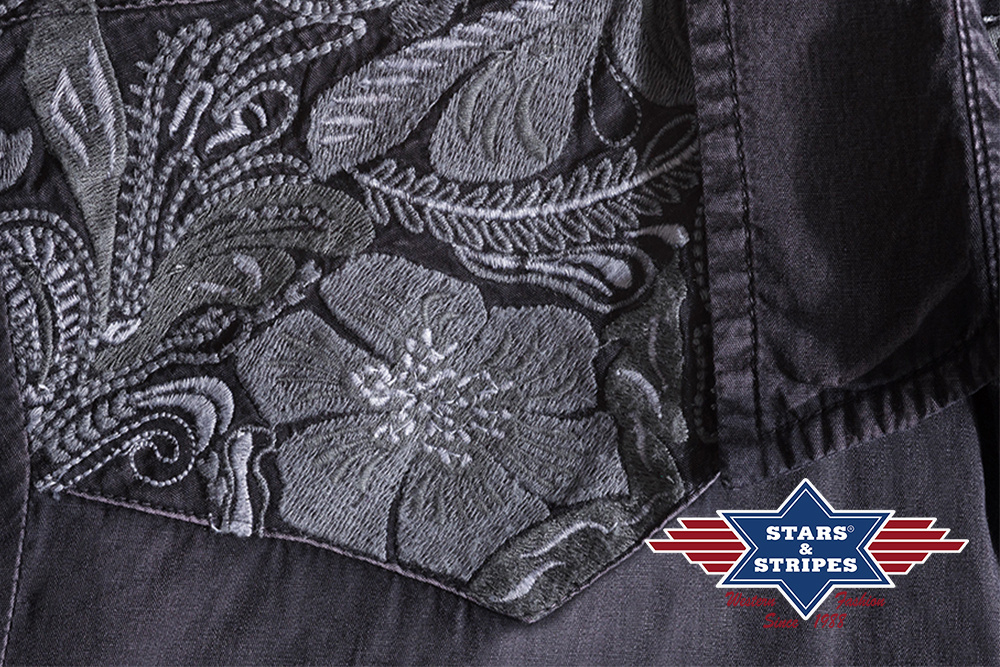 Stylová dámská košile s patinou a s vyšívaným westernovým sedlem květinového vzoru. Košili dotváří náprsní kapsy, světlé švy a černé druky. Do páru s pánskou košilí Fred.