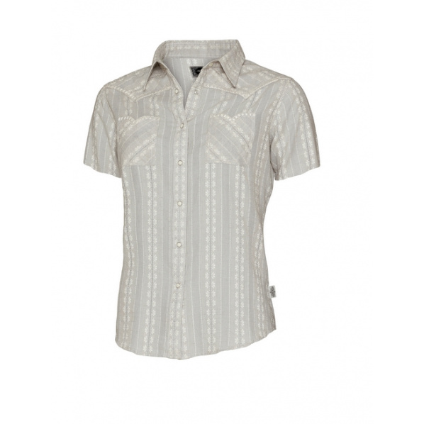 Dámská westernová halenka s krátkým rukávem zdobená tištěnými vzory a ozdobnými švy, zapínání na druky.