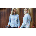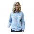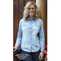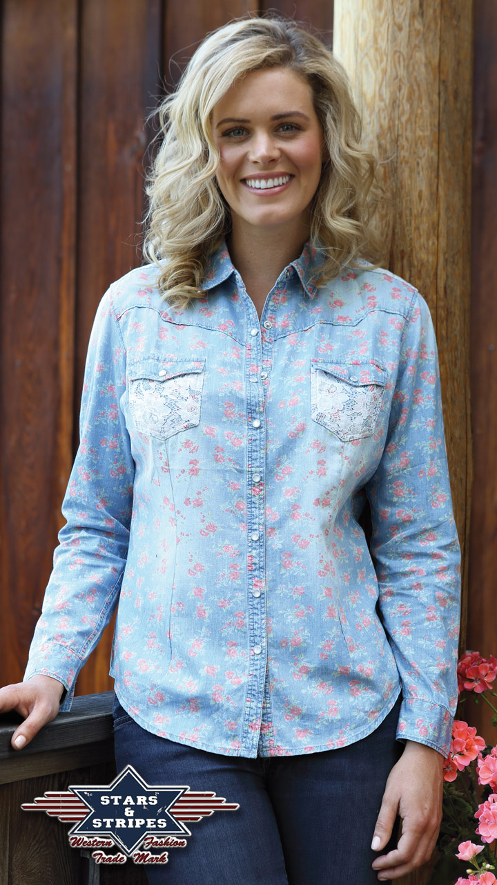 Romantická dámská riflová košile s květinkovým tištěným zdobením a krajkovým zdobením na ramenou.