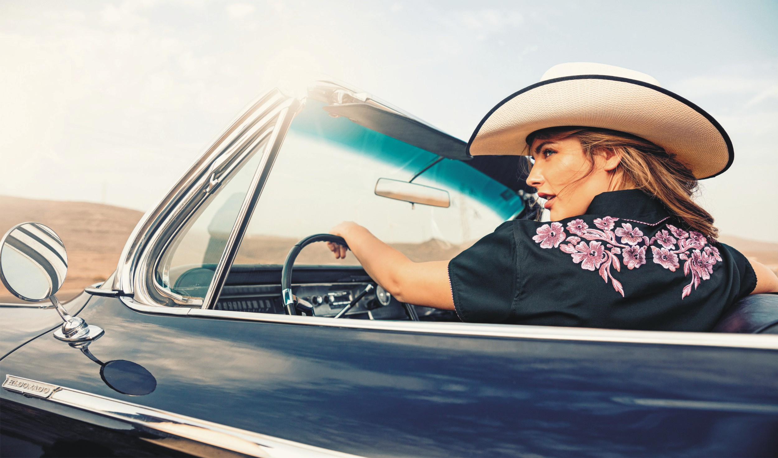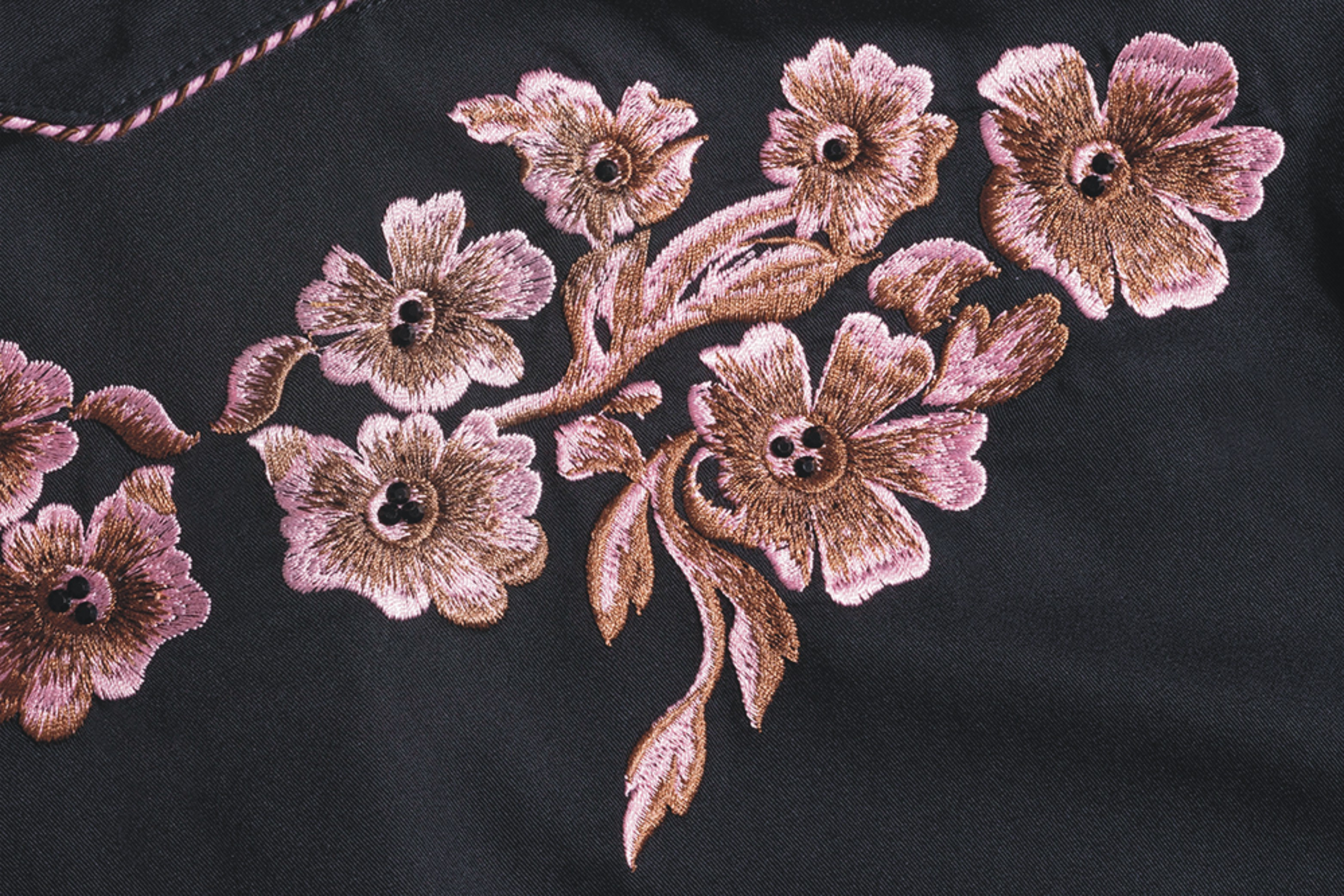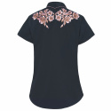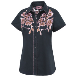 Elegantní dámská westernová halenka s krátkým rukávem a s nápadným vyšíváním na hrudi a zádech. Design doplňuje dvoubarevné lemování, druky a malé kamínky.