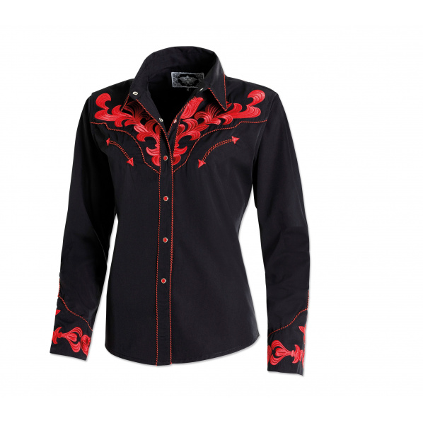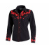 Stylová dámská westernová halenka s propracovanými vyšívanými vzory na hrudníku, ramenou, zádech a manžetách, ve stejné barvě jsou zdobené i lemy, dvě falešné kapsy a druky na zapínání.