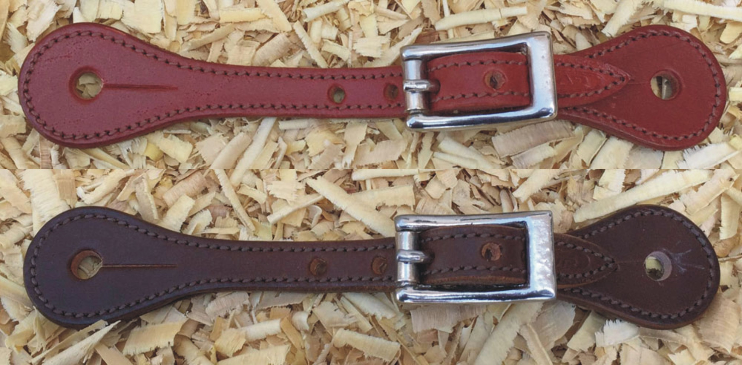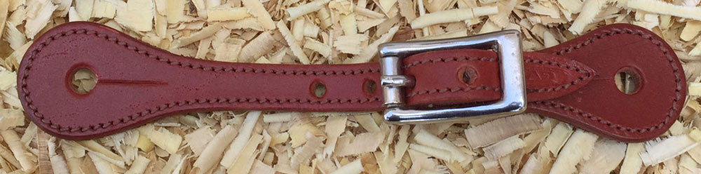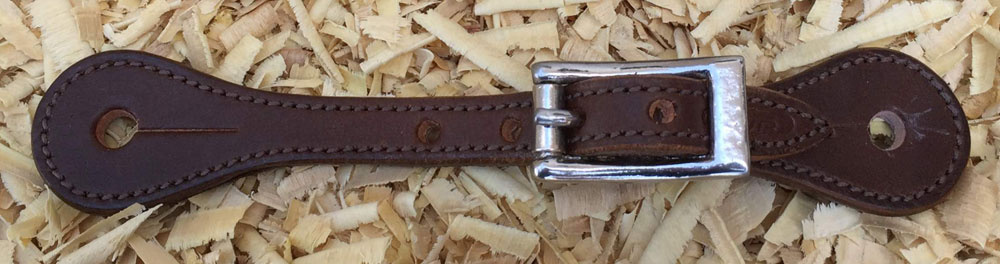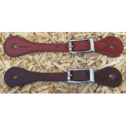 Dětské westernové kožené řemínky k ostruhám z hladké hovězí kůže, obšité a podložené telecí kůží. Nerezové kování.