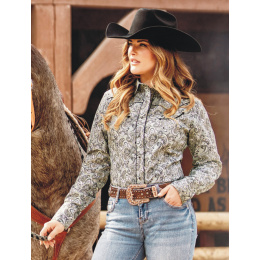 Okouzlující dámská westernová halenka s detailním paisley vzorem v decentní šedo modré kombinaci. Typické westernové sedlo, falešné náprsní kapsy, westernové manžety se 4 druky a tmavé lemování dodávají košili klasický kovbojský vzhled. Všestranná košile, která se perfektně hodí k elegantnímu i ležérnímu stylovému oblečení. Do páru a perfektně se hodí ke košili ACE.