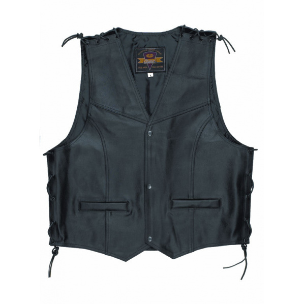 Popis výrobku Kožená vesta PatchPánská vesta z hladké hovězí kůže se šněrováním na bocích a ramenech. Dvě malé kapsy. Zapínání kovovými drucky. Lehká podšívka (100% polyester). Barva: černá