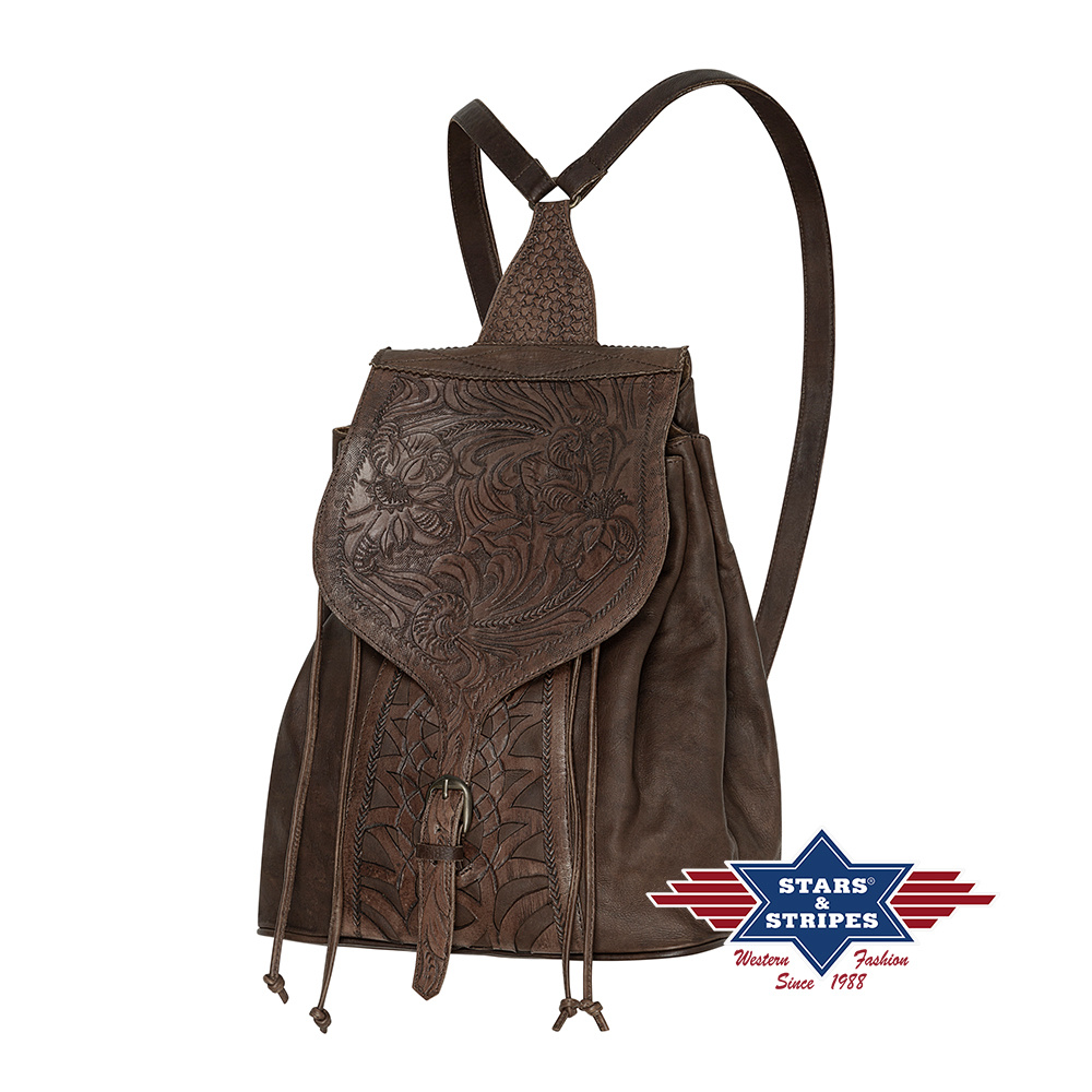 Okouzlující ručně zdobený kožený baťůžek se stahovací šňůrkou a kovovou přezkou.