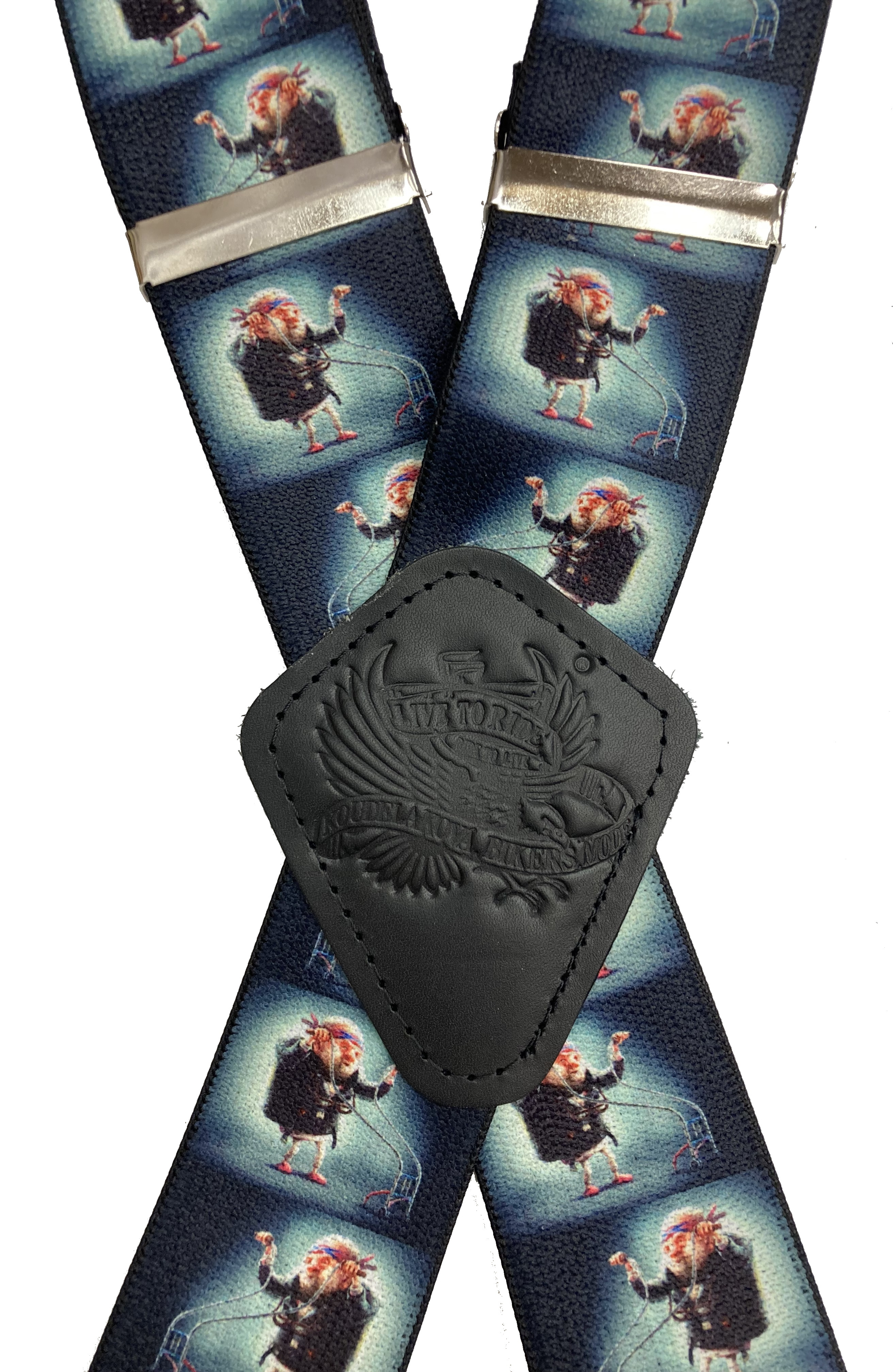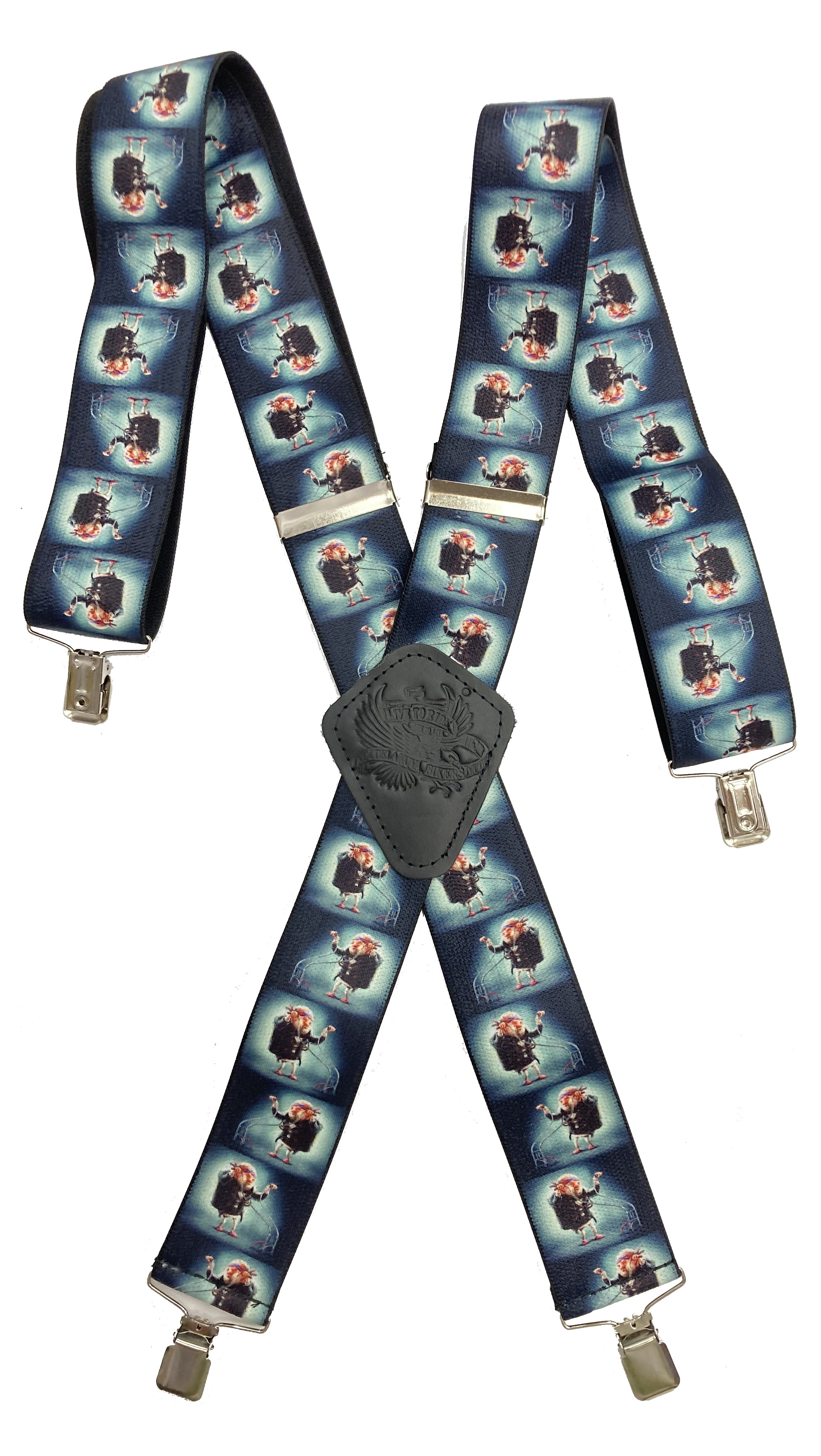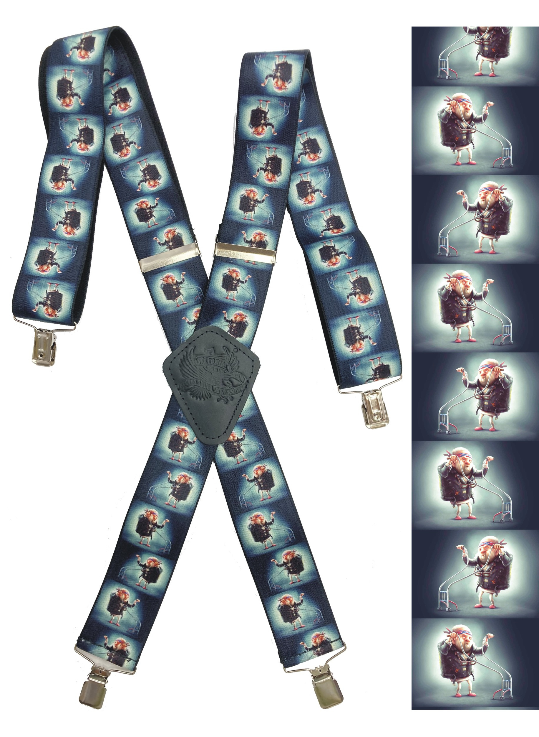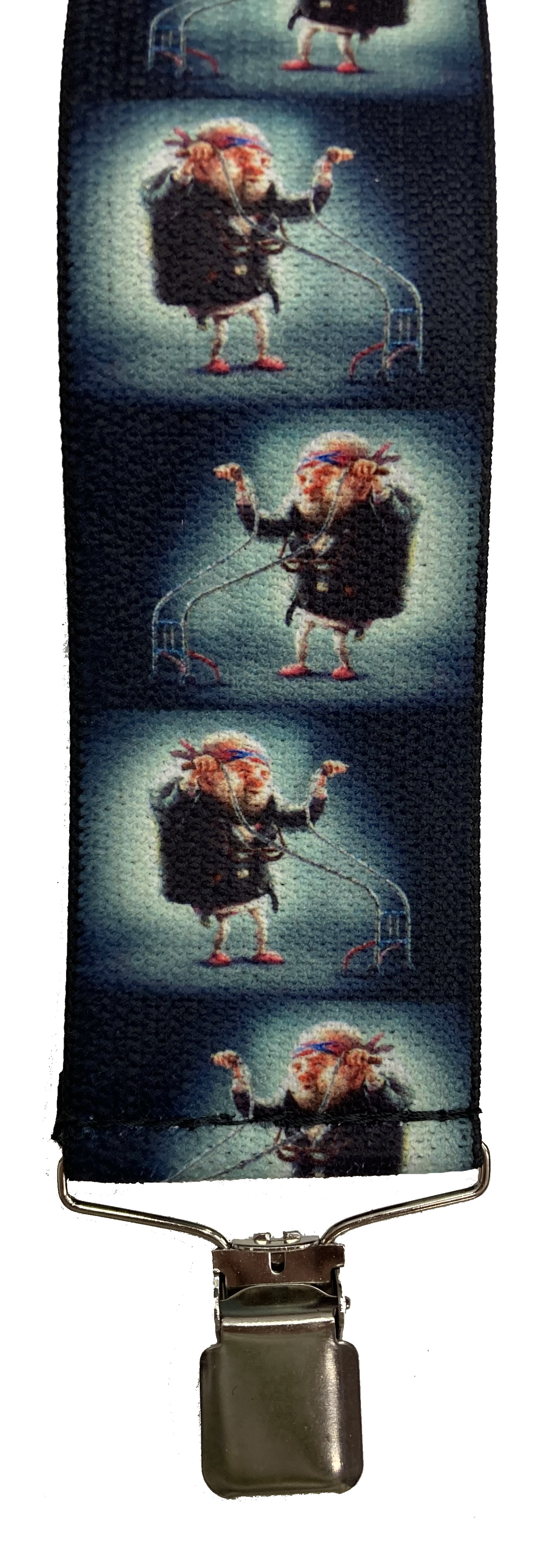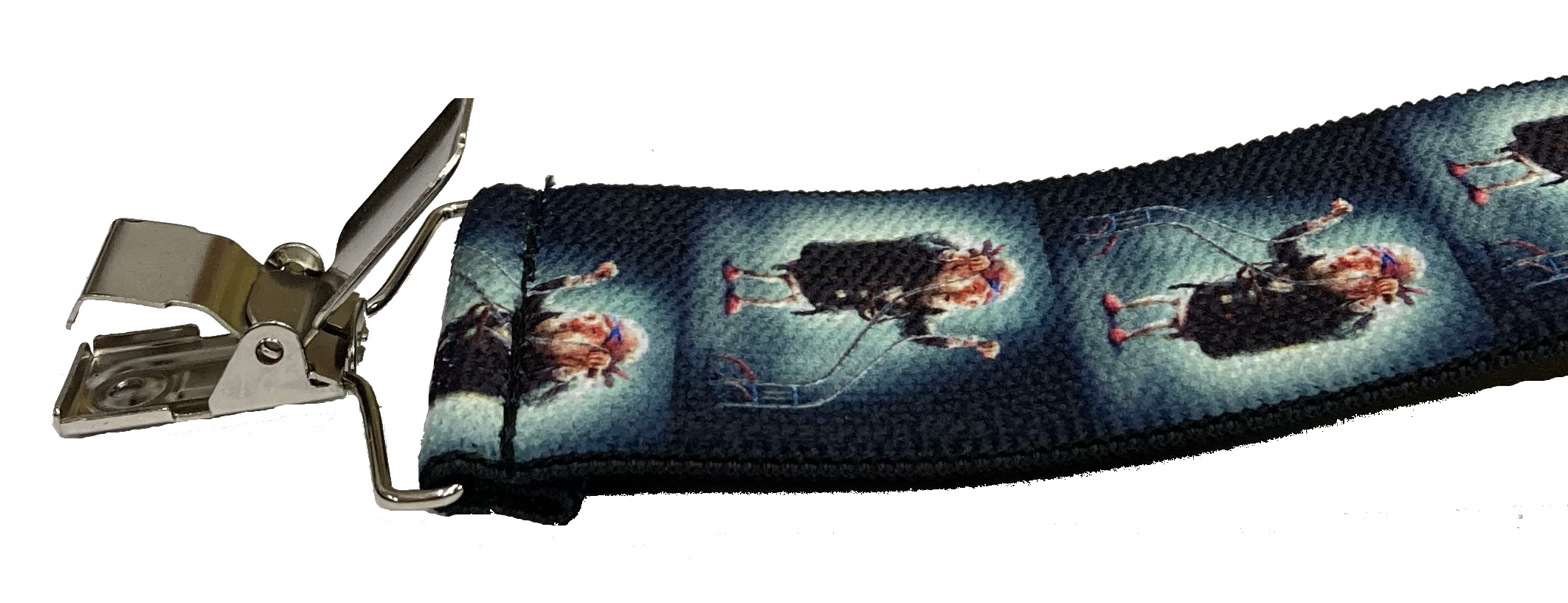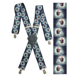Pružné kšandy s potiskem. Libovolně nastavitelné. Připnutí ke kalhotám je tvořeno kovovými sponkami, které jsou ozubené a tudíž výborně drží a nepovolí.