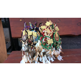 kolečka 115 mm - klasický lapač snů, na velkém kolečku visí další 3 malé o průměru cca 45 mm a nich péra, barva opletené jsou lapače opletené světlým provázkem