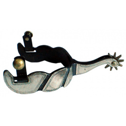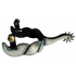 Černé ocelové show ostruhy s ručně rytým stříbrným zdobením. Se stopkou ve tvaru labutího krku a kolečkem s deseti paprsky.