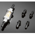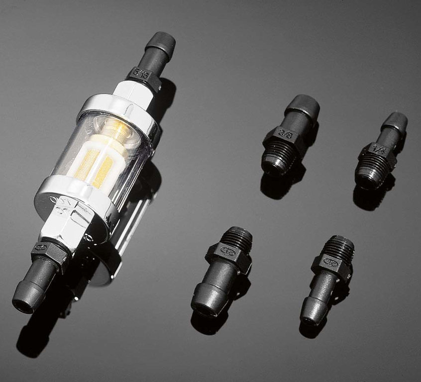 Palivový filtr, materiál: sklo/chrom, povrchová úprava: chrom. Balení: 1 ks + vyústění pro 3 různé průměry palivových hadiček.