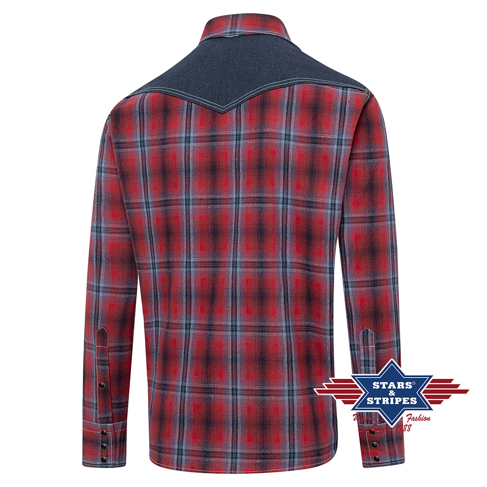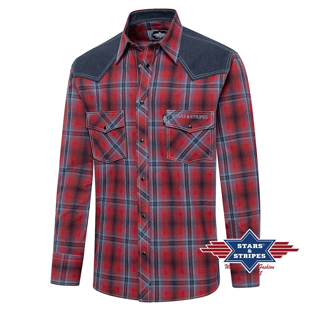 Stylová kostkovaná košile s kontrastním westernovým sedlem a našitými náprsními kapsami. Design doplňuje lem límečku a stylové druky.