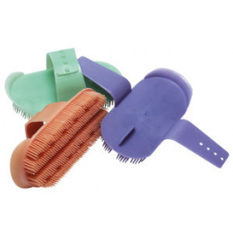 Umělohmotné hřbílko s nastavitelným páskem na hřbetu ruky. Délka 19 cm.