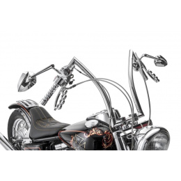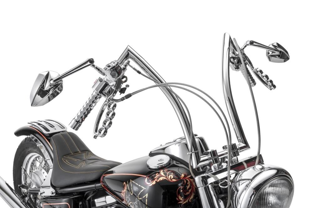Motocyklová custom řídítka Bad Ape tecno od výrobce Highway Hawk s homologací TÜV §19/3. Řídítka jsou opatřeny otvory pro protažení kabeláže od domečků k vidlici, pro jednodušší práci je uvnitř umístěn drát, který lze využít pro protažení. Průměr řídítek je 32 mm.