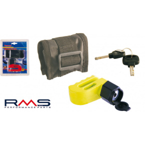 Zámek brzdového kotouče RMS Micro. Materiál: ocel Čep: 6 mm Rozměr: cca 45x45x25 mm Barva: žlutá