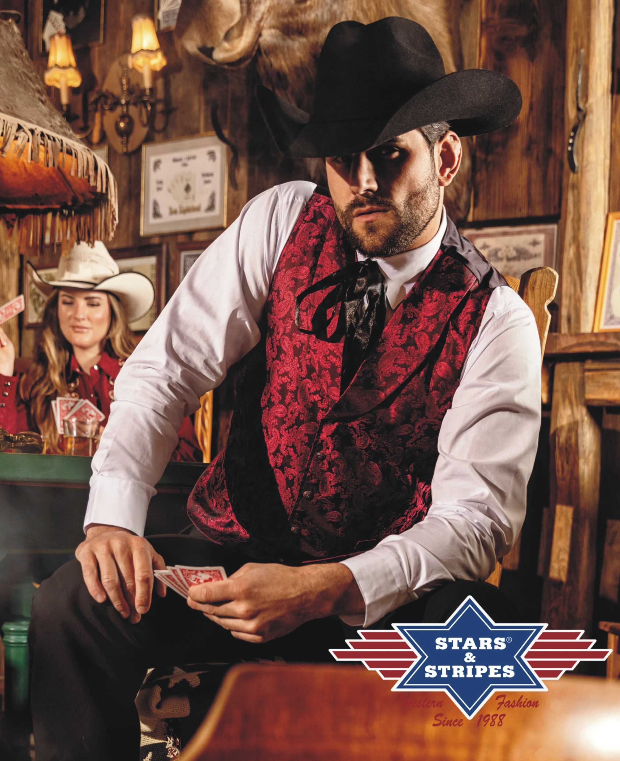 Luxusní westernová vesta zdobená paisley vzorem, se dvěma bočními kapsami a dekorativními knoflíky. Možnost úpravy velikosti pasu pomocí stahovacího proužku na zádové straně vesty.